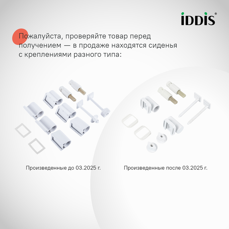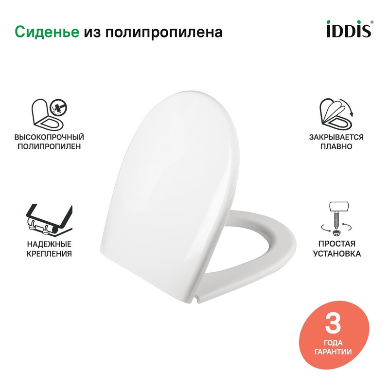 Пластиковое сиденье для унитаза IDDIS® белого цвета классической округлой формы. Сиденье изготовлено из полипропилена – он обладает высокой износостойкостью, устойчивостью к агрессивным химическим веществам, экологичен и безопасен для здоровья. • Специальные амортизаторы обеспечивают плавное и бесшумное закрытие крышки и сиденья унитаза, что предотвращает повреждение поверхности унитаза. • Универсальный крепеж: три варианта крепления, входящие в комплект сиденья, позволяют установить его на максимально большое количество моделей унитазов. Не нужно тратить время на дополнительные замеры. Крепления прочно и надежно фиксируют сиденье на унитазе и не расшатываются со временем. • Гарантия на сиденье для унитаза IDDIS® 3 года, чтобы вы были уверены в его надежности и высоком качестве. (с) Авторский текст, июнь 2020 г.
