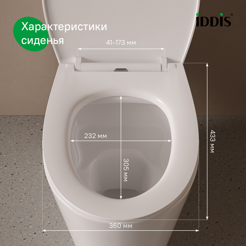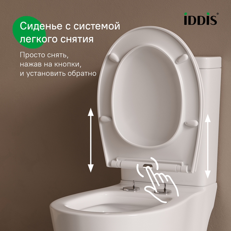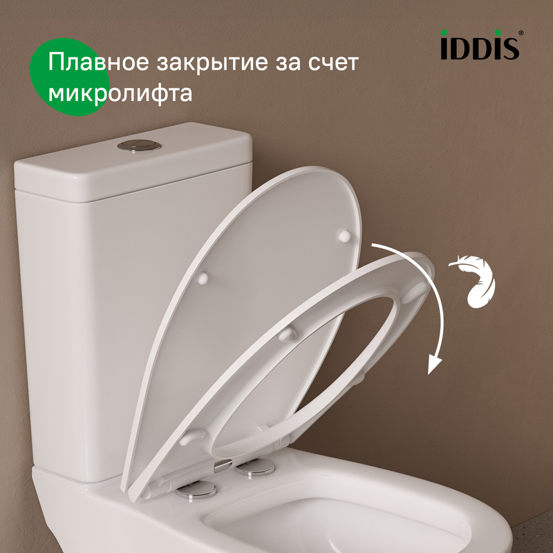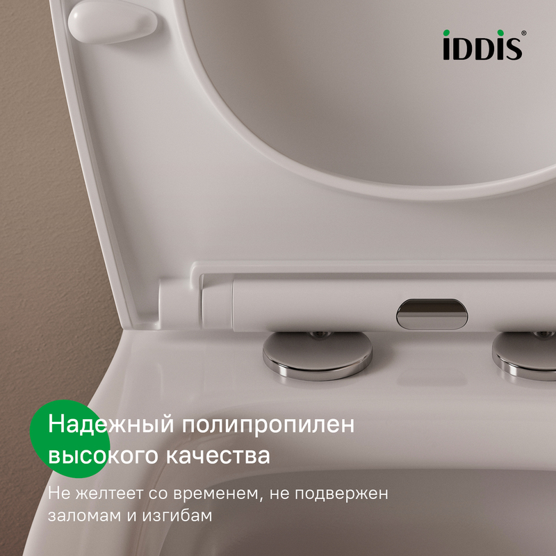 Пластиковое белое сиденье для унитаза IDDIS® овальной slim-формы – универсальный выбор благодаря высокой совместимости с популярными унитазами на рынке. • Современная slim-форма — с уменьшенной толщиной сиденья и крышки, что формирует более изящный профиль, аккуратную линию в закрытом и открытом виде, ощущение «премиальной» простоты. • Изготовлено из полипропилена – он имеет высокую износостойкость, устойчивость к агрессивным химическим веществам, экологичен и безопасен для здоровья. • Специальные амортизаторы (микролифт) обеспечивают плавное и бесшумное закрытие крышки и сиденья унитаза, что предотвращает повреждение поверхности унитаза. • Благодаря удобным съёмным креплениям сиденье легко снимается с чаши на время уборки и без труда устанавливается обратно. • Крепления прочно и надежно фиксируют сиденье на унитазе и не расшатываются со временем Гарантия на сиденье для унитаза IDDIS® – 3 года. (с) Авторский текст, февраль 2026 г.