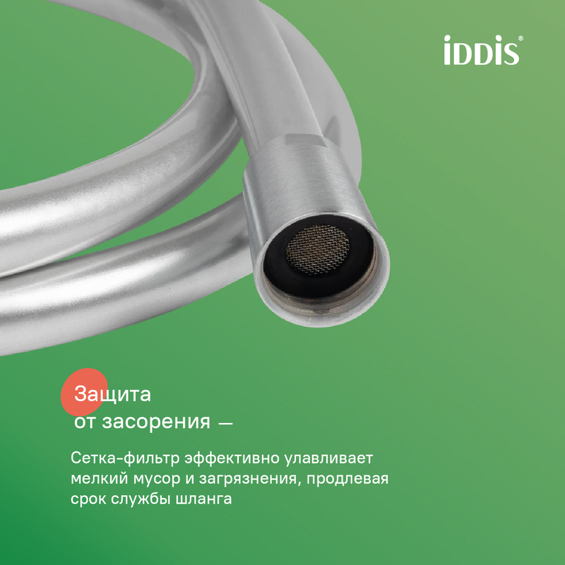 Стильный гладкий душевой шланг в оттенке матового хрома надежен и легко выдерживает активную ежедневную эксплуатацию. Универсальное соединение G ½” позволяет использовать с любой лейкой в тон. Стандартная длина 1,5 м. • Из гладкого ПВХ, не поцарапает деликатную поверхность акриловых ванн и поддонов. • Эластичный внутренний шланг из современного полимерного материала прочный, выдерживает растяжение и температурные перепады, не склонен к пересыханию и растрескиванию. • Специальное шарнирное соединение защищает шланг от перекручивания и обеспечивает комфортное использование. Можно не бояться изгибов и заломов. • Надежно сидит в держателе за счет резинового уплотнительного кольца на конической гайке. • Просто ухаживать: протирать салфеткой, можно с мягким моющим средством. Гарантия на душевые аксессуары IDDIS® – 3 года. (с) Авторский текст, сентябрь 2023 г.