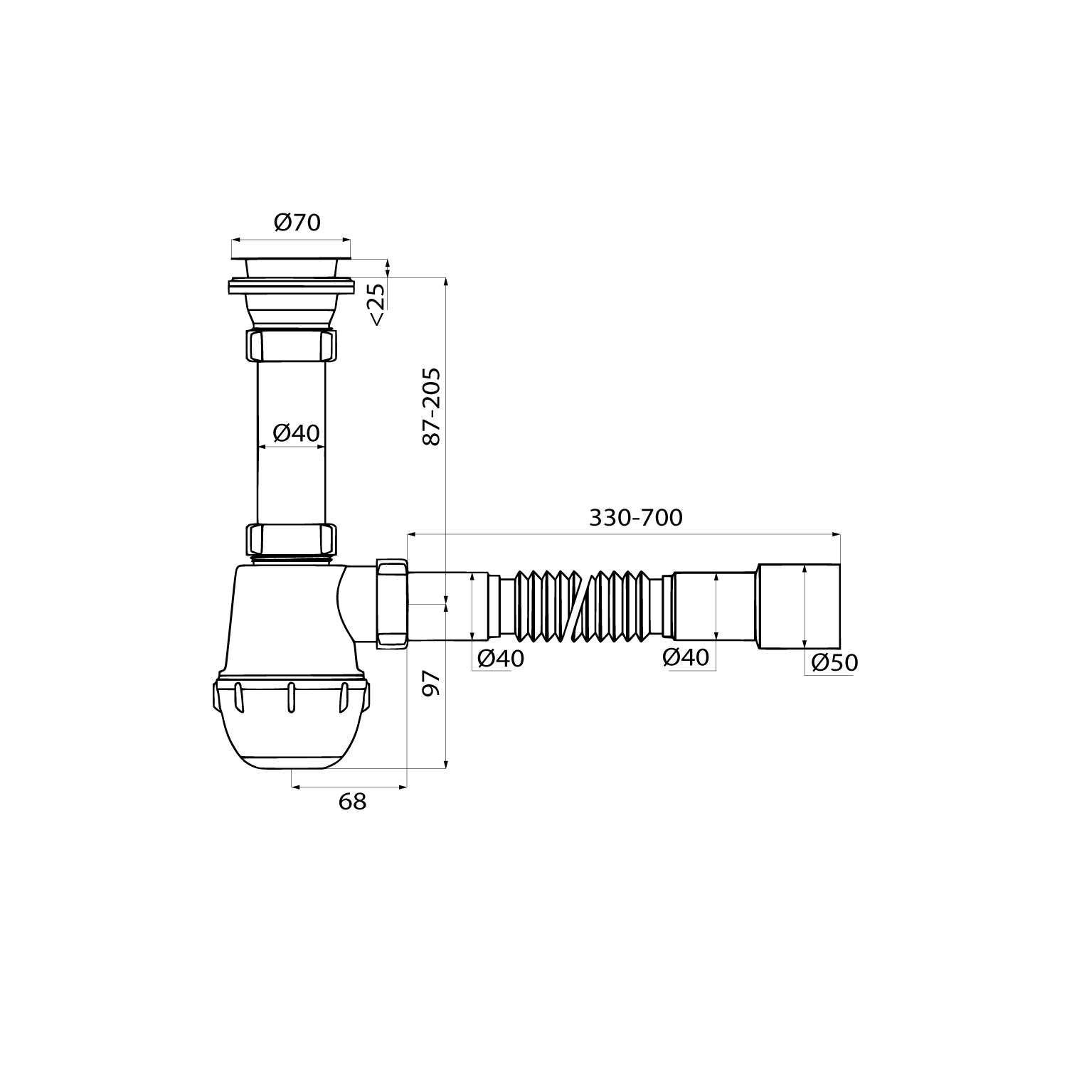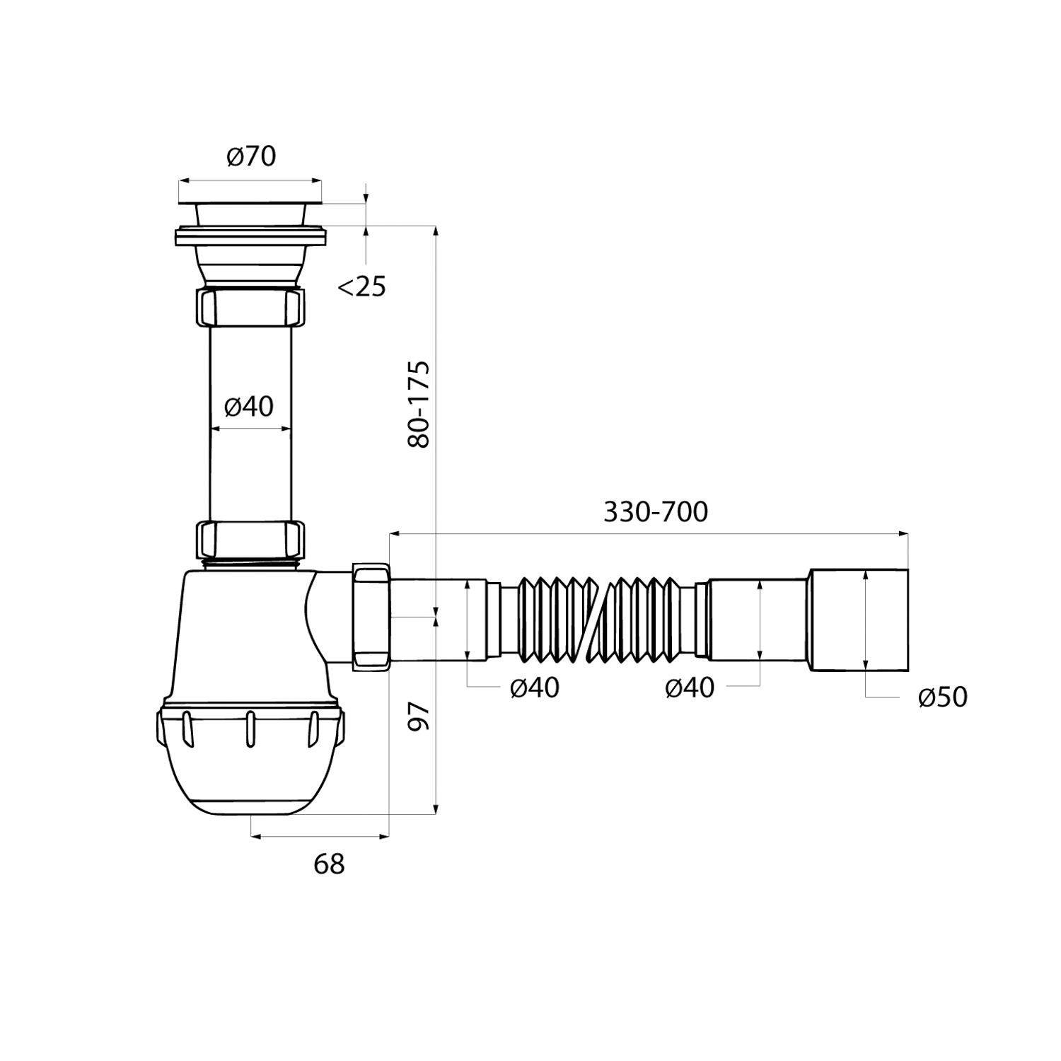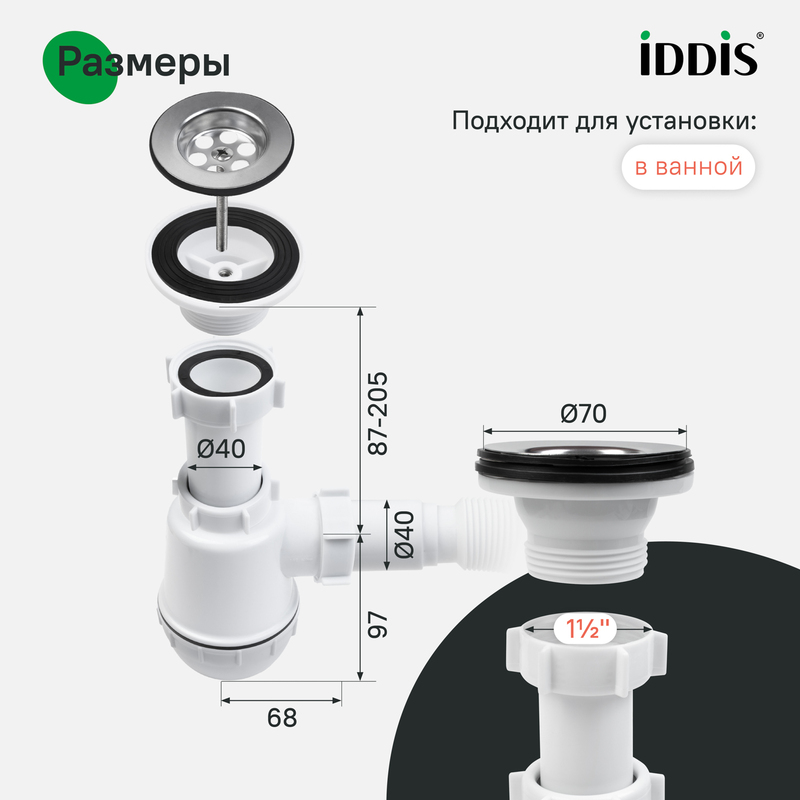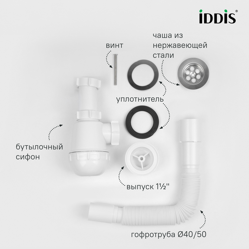 Сифон бутылочного типа с выпуском и гофротрубой 40/50 мм подходит для установки в ванной комнате. Размер: 1.1/2xØ40 мм. • Регулируется по высоте от 184 до 302 мм. • Гофротруба длиной от 330 до 700 мм позволяет установить сифон без точной подгонки под канализационный вывод. • Монтажная гайка интегрирована в корпус выпуска, что облегчает установку. • Высокое качество обработки: ровные швы, отсутствие дефектов и надежное сцепление резьбы. • Металлические элементы выполнены из качественной нержавеющей стали AISI 304. • Гладкая поверхность корпуса снижает накопление грязи и позволяет сохранить привлекательный внешний вид надолго. • Надежные материалы корпуса, металлических элементов и уплотнителей обеспечивают герметичность соединения и не деформируются под воздействием воды. • Монтажный винт имеет универсальную резьбу под крестовую и плоскую отвертки. • Сифон уже собран, что исключает риск повреждений и ошибок при монтаже. • Прост в обслуживании: стакан легко снять и прочистить. • В комплекте всё необходимое для быстрой и простой установки: гофротруба с диаметром подключения 40 или 50 мм за счет переходника. Гарантия на сифоны IDDIS® – 2 года. (с) Авторский текст, сентябрь 2025 г.