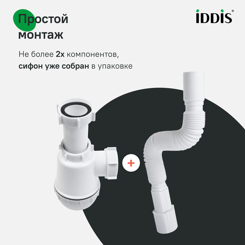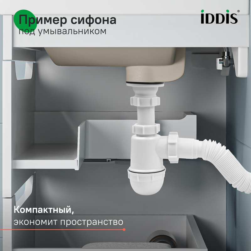 Сифон бутылочного типа без выпуска, с гофротрубой 40/50 мм подходит для установки в ванной комнате. Размер: 1.1/4xØ40 мм. • Регулируется по высоте от 182 до 300 мм. • Гофротруба длиной от 330 до 700 мм позволяет установить сифон без точной подгонки под канализационный вывод. • Высокое качество обработки: ровные швы, отсутствие дефектов и надежное сцепление резьбы. • Гладкая поверхность корпуса снижает накопление грязи и позволяет сохранить привлекательный внешний вид надолго. • Надежные материалы корпуса и уплотнителей обеспечивают герметичность соединения и не деформируются под воздействием воды. • Сифон уже собран, что исключает риск повреждений и ошибок при монтаже. • Прост в обслуживании: стакан легко снять и прочистить. • В комплекте всё необходимое для быстрой и простой установки: гофротруба с диаметром подключения 40 или 50 мм за счет переходника. Гарантия на сифоны IDDIS® – 2 года. (с) Авторский текст, сентябрь 2025 г.