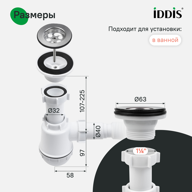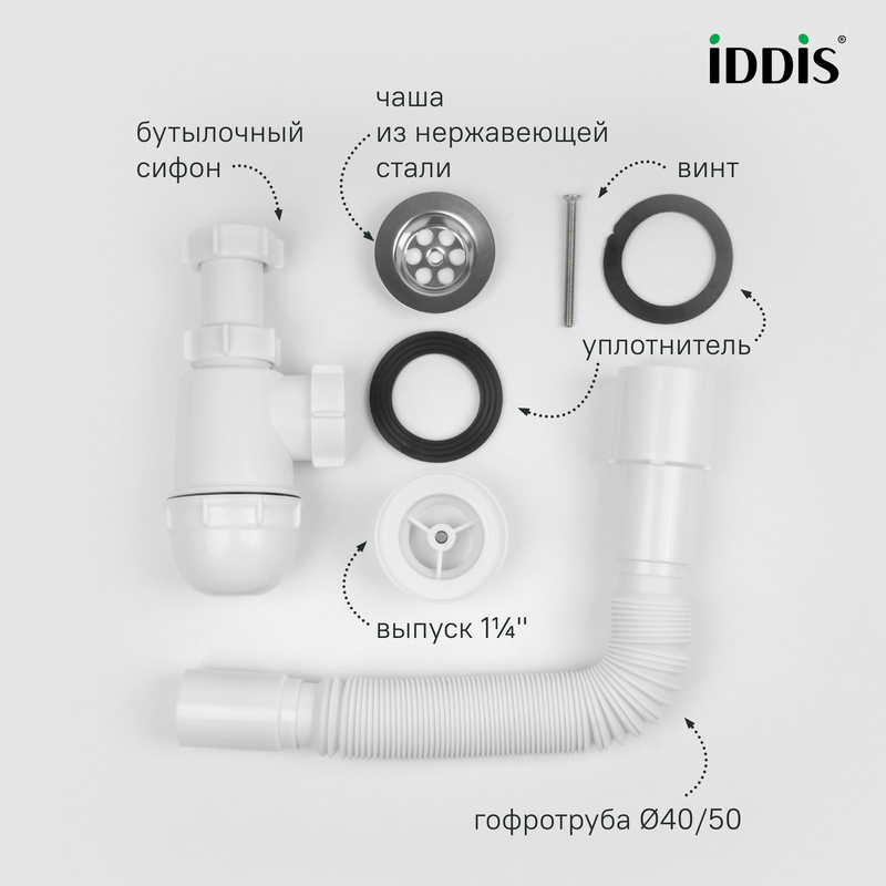 Сифон бутылочного типа с выпуском и гофротрубой 40/50 подходит для установки в ванной комнате. Размер: 1.1/4xØ40 мм. • Регулируется по высоте от 204 до 322 мм. • Гофротруба длиной от 330 до 700 мм позволяет установить сифон без точной подгонки под канализационный вывод. • Монтажная гайка интегрирована в корпус выпуска, что облегчает установку. • Высокое качество обработки: ровные швы, отсутствие дефектов и надежное сцепление резьбы. • Металлические элементы выполнены из качественной нержавеющей стали AISI 304. • Гладкая поверхность корпуса снижает накопление грязи и позволяет сохранить привлекательный внешний вид надолго. • Надежные материалы корпуса, металлических элементов и уплотнителей обеспечивают герметичность соединения и не деформируются под воздействием воды. • Монтажный винт имеет универсальную резьбу под крестовую и плоскую отвертки. • Сифон уже собран, что исключает риск повреждений и ошибок при монтаже. • Прост в обслуживании: стакан легко снять и прочистить. • В комплекте всё необходимое для быстрой и простой установки: гофротруба с диаметром подключения 40 или 50 мм за счет переходника. Гарантия на сифоны IDDIS® – 2 года. (с) Авторский текст, сентябрь 2025 г.