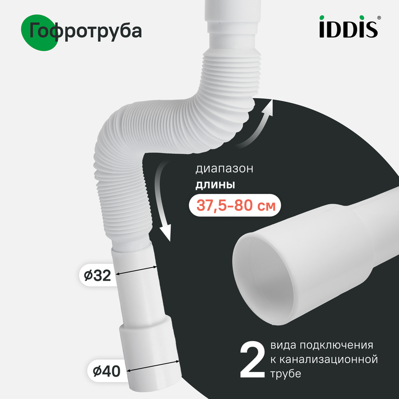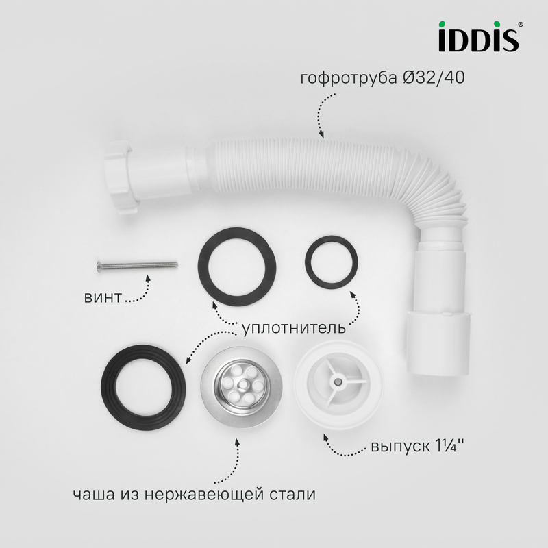 Сифон гофрированного типа с выпуском подходит для установки в ванной комнате. Размер: 1.1/4х32/40 мм. • Гофротруба длиной от 375 до 800 мм позволяет установить сифон без точной подгонки под канализационный вывод. • Монтажная гайка интегрирована в корпус выпуска, что облегчает установку. • Высокое качество обработки: ровные швы, отсутствие дефектов и надежное сцепление резьбы. • Металлические элементы выполнены из качественной нержавеющей стали AISI 304. • Гладкая поверхность корпуса снижает накопление грязи и позволяет сохранить привлекательный внешний вид надолго. • Надежные материалы корпуса, металлических элементов и уплотнителей обеспечивают герметичность соединения и не деформируются под воздействием воды. • Монтажный винт имеет универсальную резьбу под крестовую и плоскую отвертки. • Сифон уже собран, что исключает риск повреждений и ошибок при монтаже. • Прост в обслуживании. • Оснащен переходником подключения к канализации на 32 или 40 мм для быстрой и простой установки. Гарантия на сифоны IDDIS® – 2 года. (с) Авторский текст, сентябрь 2025 г.