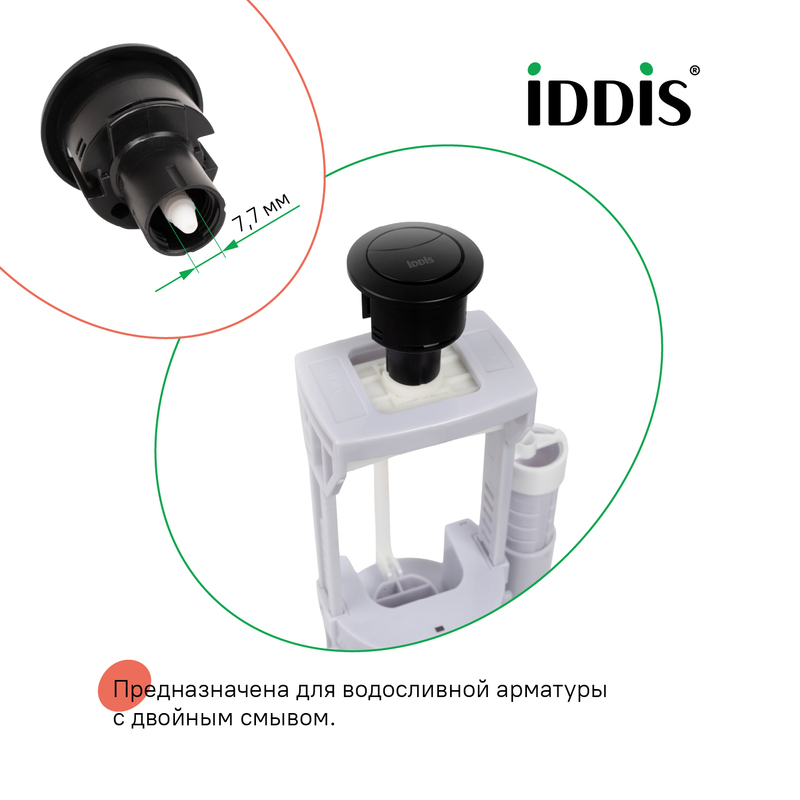 Кнопка слива в стильном матовом черном цвете для установки на бачок унитаза – возможность оформить интерьер ванной комнаты в едином стиле и цвете с остальной сантехникой и аксессуарами. Оптимальный диаметр кнопки делает ее удобной для нажатия и женской, и мужской рукой. Предназначена для водосливной арматуры с двойным смывом – полным и частичным, что позволяет выбирать подходящий и экономить тем самым расход воды. Подходит для бачков с отверстием под кнопку диаметром от 38 до 45 мм. Изготовлена из прочного ABS-пластика с цветным покрытием, стойким к царапинам и истиранию. Гарантия на кнопки слива IDDIS® – 3 года. (с) Авторский текст, сентябрь 2022 г.