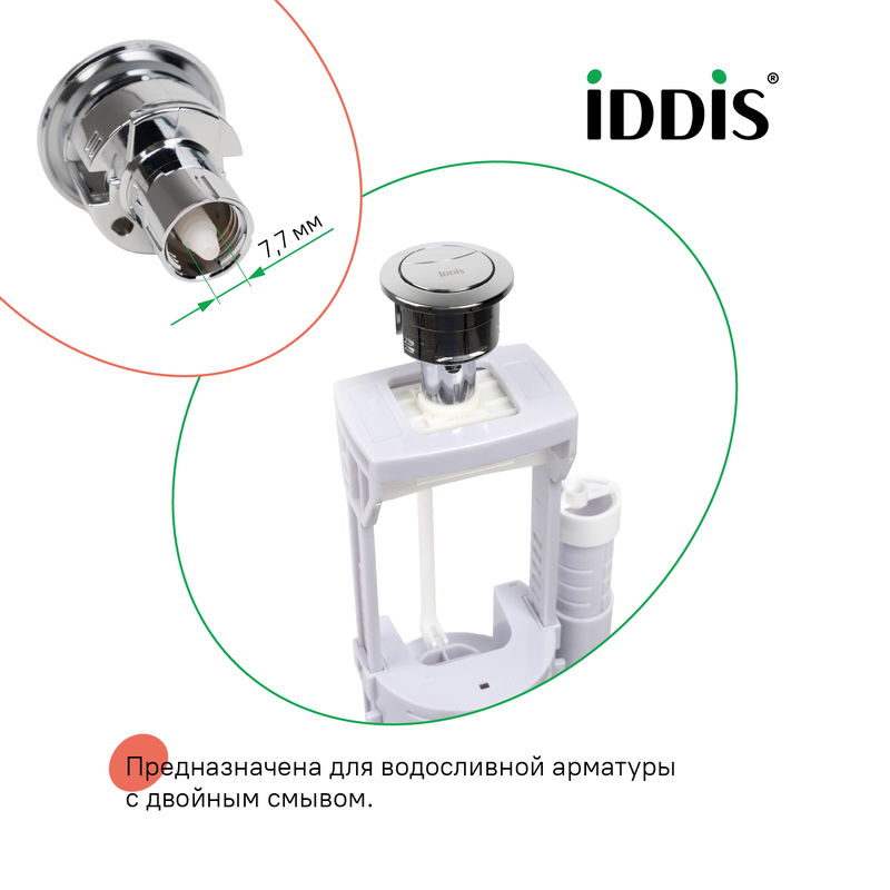 Кнопка слива с хромированным покрытием для установки на бачок унитаза. Оптимальный диаметр кнопки 38 мм делает ее удобной для нажатия и женской, и мужской рукой. Предназначена для водосливной арматуры с двойным смывом – полным и частичным, что позволяет выбирать подходящий и экономить тем самым расход воды. Подходит для бачков с отверстием под кнопку диаметром от 38 до 45 мм. Изготовлена из прочного ABS-пластика с хромированным покрытием, стойким к царапинам и истиранию. Гарантия на кнопки слива IDDIS® – 3 года. (с) Авторский текст, сентябрь 2022 г.