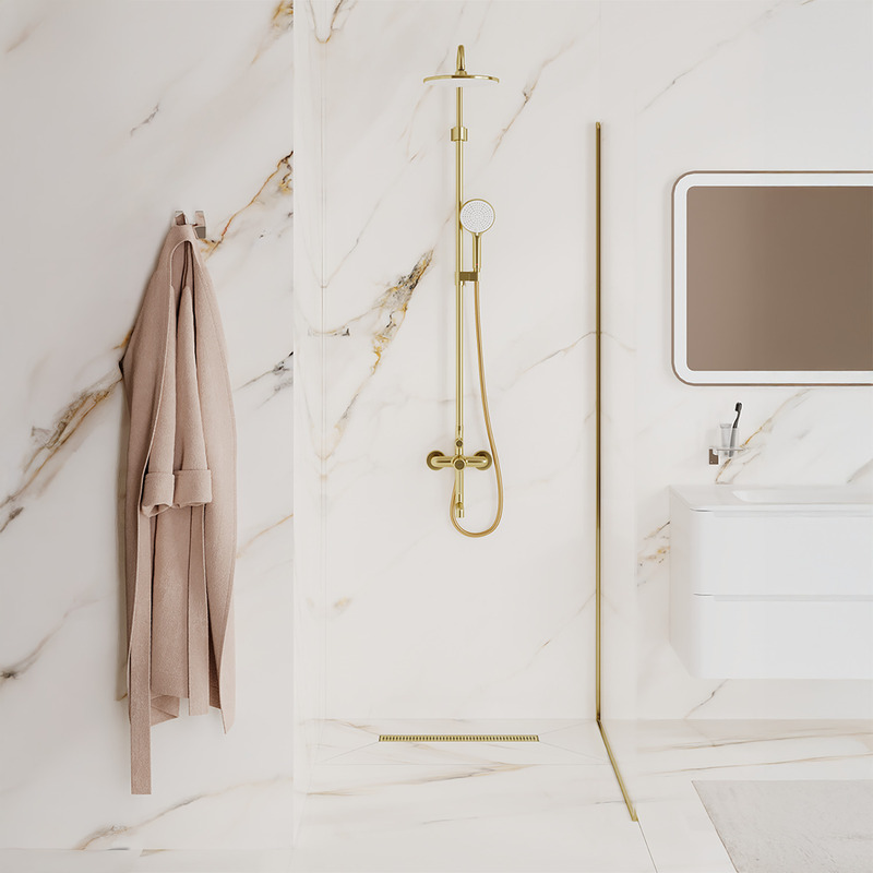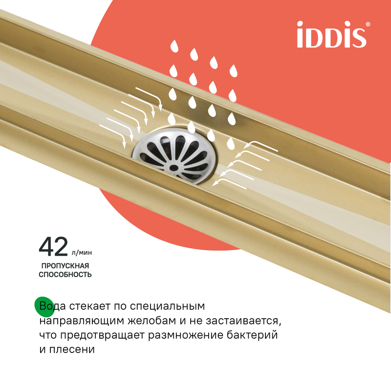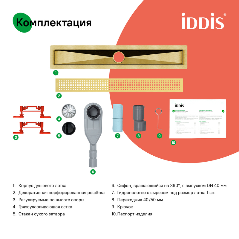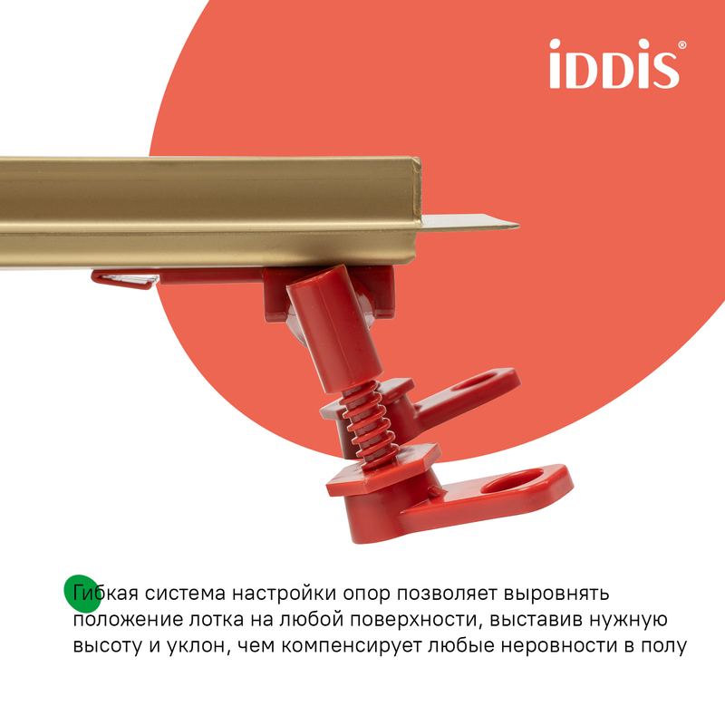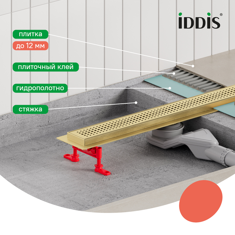 Душевой лоток IDDIS® в золотом цвете с горизонтальным выпуском и сифоном 360° предназначен для отведения воды в канализацию из зоны принятия душа. Он заменит традиционные поддоны с бортиками, предлагая универсальный дизайн решетки и возможности для создания стильного интерьера ванной комнаты. Длина решетки — 500 мм; подходит для плитки толщиной до 12 мм. • Благодаря поворотному механизму сифона, его можно установить в удобном месте, независимо от того, где находится подключение к канализации. • Высокая пропускная способность — 42 л/мин. • Легко очищается: удобно разобрать и промыть. • Оснащен сухим затвором, защищающим от неприятного запаха даже после испарения воды в сифоне. • Изготовлен из толстой высококачественной нержавеющей стали AISI 304, обеспечивающей долговечность, надежность и безопасность. • Регулируемые опоры позволяют адаптировать лоток по высоте. • В комплекте все необходимое для монтажа: гидрополотно с вырезом под размеры лотка, переходник 40/50, фильтр для волос и крючок для извлечения сетки. Покрытие устойчиво к коррозии, появлению царапин, сколов и потускнению. На протяжении многих лет он будет выглядеть как новый. Гарантия на душевые лотки IDDIS® – 10 лет. (с) Авторский текст, май 2025 г.