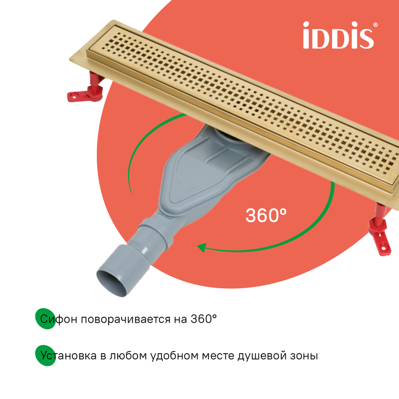 Душевой лоток IDDIS® в золотом цвете с горизонтальным выпуском и сифоном 360° предназначен для отведения воды в канализацию из зоны принятия душа. Он заменит традиционные поддоны с бортиками, предлагая универсальный дизайн решетки и возможности для создания стильного интерьера ванной комнаты. Длина решетки — 800 мм; подходит для плитки толщиной до 12 мм. • Благодаря поворотному механизму сифона, его можно установить в удобном месте, независимо от того, где находится подключение к канализации. • Высокая пропускная способность — 42 л/мин. • Легко очищается: удобно разобрать и промыть. • Оснащен сухим затвором, защищающим от неприятного запаха даже после испарения воды в сифоне. • Изготовлен из толстой высококачественной нержавеющей стали AISI 304, обеспечивающей долговечность, надежность и безопасность. • Регулируемые опоры позволяют адаптировать лоток по высоте. • В комплекте все необходимое для монтажа: гидрополотно с вырезом под размеры лотка, переходник 40/50, фильтр для волос и крючок для извлечения сетки. Покрытие устойчиво к коррозии, появлению царапин, сколов и потускнению. На протяжении многих лет он будет выглядеть как новый. Гарантия на душевые лотки IDDIS® – 10 лет. (с) Авторский текст, май 2025 г.