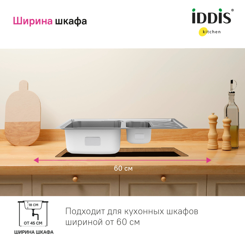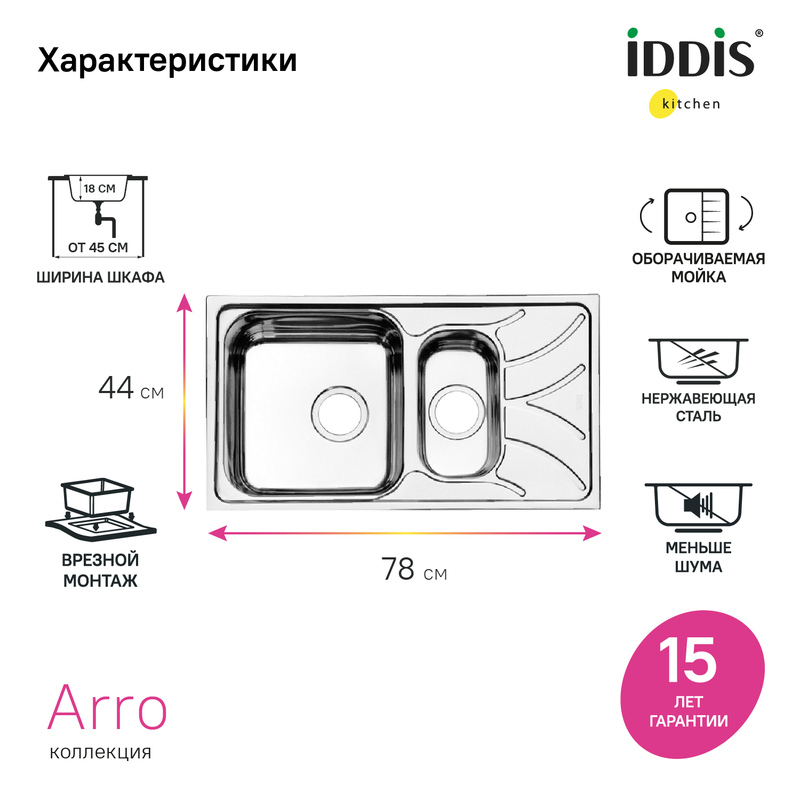 Arro – функциональная мойка в минималистичном дизайне с двумя чашами, основной и вспомогательной, которые используются как отдельные рабочие зоны. Крыло с узором удобно использовать для сушки столовых приборов. Мойка имеет текстуру с эффектом шелковой поверхности благодаря специальной обработке стали. • Мойка из качественной нержавеющей стали AISI 304; сталь содержит 18% хрома и 8% никеля, что надежно защищает ее от коррозии. Стойкая к износу, выдерживает различные t, легко моется, долго служит. При правильном уходе надолго сохранит привлекательный внешний вид. • Специальное антишумовое покрытие и полимерные накладки на обороте снижают шум при использовании. • Монтаж максимально удобен и универсален: мойка устанавливается сверху в столешницу – крылом налево или направо, врезным способом (подстольный монтаж не предусмотрен). Вырез под мойку составляет 420х760хR20 мм; ширина шкафа от 60 см. • Все необходимое для монтажа в комплекте: крепеж и шаблон для выреза в столешнице, эластичная уплотнительная лента, которая защитит периметр мойки от протечек. Сифон приобретается отдельно. Гарантия на мойку Arro – 15 лет, на крепления – 1 год. (с) Авторский текст, декабрь 2025 г.