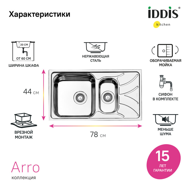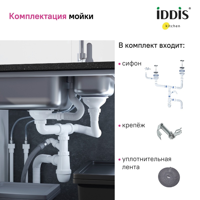 Оборачиваемая мойка из нержавеющей стали с сатиновым покрытием с сифоном в комплекте – продуманное решение, готовое к использованию. • Есть все для монтажа: выпуск, сифон, уплотнительная лента, крепеж. • Экономичная покупка – комплектом выгоднее. • Полуторная чаша и крыло для комфорта на кухне. • Мойка из качественной нержавеющей стали AISI 304 толщиной 0,8 мм; сталь содержит 18% хрома и 8% никеля, что надежно защищает ее от коррозии. Стойкая к износу, выдерживает различные t, легко моется, долго служит. При правильном уходе надолго сохранит привлекательный внешний вид. • Есть отверстие под перелив. • Выпуск из качественного полипропилена выдержит воздействие воды и бытовой химии; сетчатая корзинка из нержавеющей стали, хромированный шток, винт и ручка из латуни. • Сифон с отдельным отводом для стиральной/посудомоечной машины с обратным клапаном и гофрированными отводами для удобства подключения. Гарантия на стальные мойки IDDIS® – 15 лет, на сифон и крепления – 1 год. (с) Авторский текст, декабрь 2023 г.