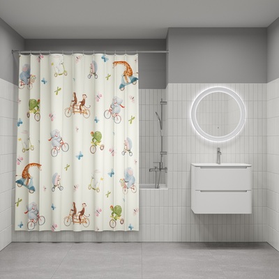 Текстильная штора для ванной ванильного цвета с забавным разноцветным принтом в виде зверей на велосипедах, самокатах и мопедах. Идеально подойдет для детской или семейной ванной комнаты • Изготовлена из износостойкого полиэстера с водоотталкивающей пропиткой. При попадании на ткань вода не впитывается, а скатывается каплями, даже при сильном напоре воды. • В комплекте 12 колец С-формы из прозрачного пластика. • По верхнему краю расположены 12 прозрачных пластиковых люверсов. • Штора имеет утяжеляющую нить по нижнему краю, которая позволяет избежать задирания ткани. • Легко ухаживать: шторку для ванной комнаты можно стирать в стиральной машине в деликатном режиме и гладить утюгом на минимальной температуре. Гарантия на текстильные аксессуары IDDIS® – 1 год. (с) Авторский текст, сентябрь 2023 г.