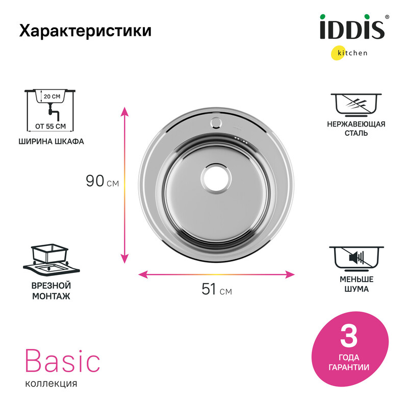 Универсальная коллекция моек Basic – грамотное решение для оснащения эффективного кухонного пространства. Любая мойка коллекции отлично подходит для выполнения повседневных задач на современной кухне и гармонично сочетается с кухонной утварью и аксессуарами. Круглая модель диаметром 510 мм составит комплект с гарнитурами и тумбами шириной от 55 см. Мойка Basic с полированной поверхностью проходит несколько этапов обработки, что позволяет получить красивый зеркальный блеск. • Мойка IDDIS® изготовлена из нержавеющей стали AISI 201 толщиной 0,6 мм; сталь содержит 16% хрома и 1% никеля, что надежно защищает от коррозии. • Специальное антишумовое покрытие и полимерные накладки на оборотной стороне чаши снижают шум при использовании мойки. • Все необходимое для монтажа в комплекте: крепеж и шаблон для выреза в столешнице, эластичная уплотнительная лента, которая защитит периметр мойки от протечек. Сифон приобретается отдельно. Гарантия на мойку Basic – 3 года. (с) Авторский текст, апрель 2022 г.