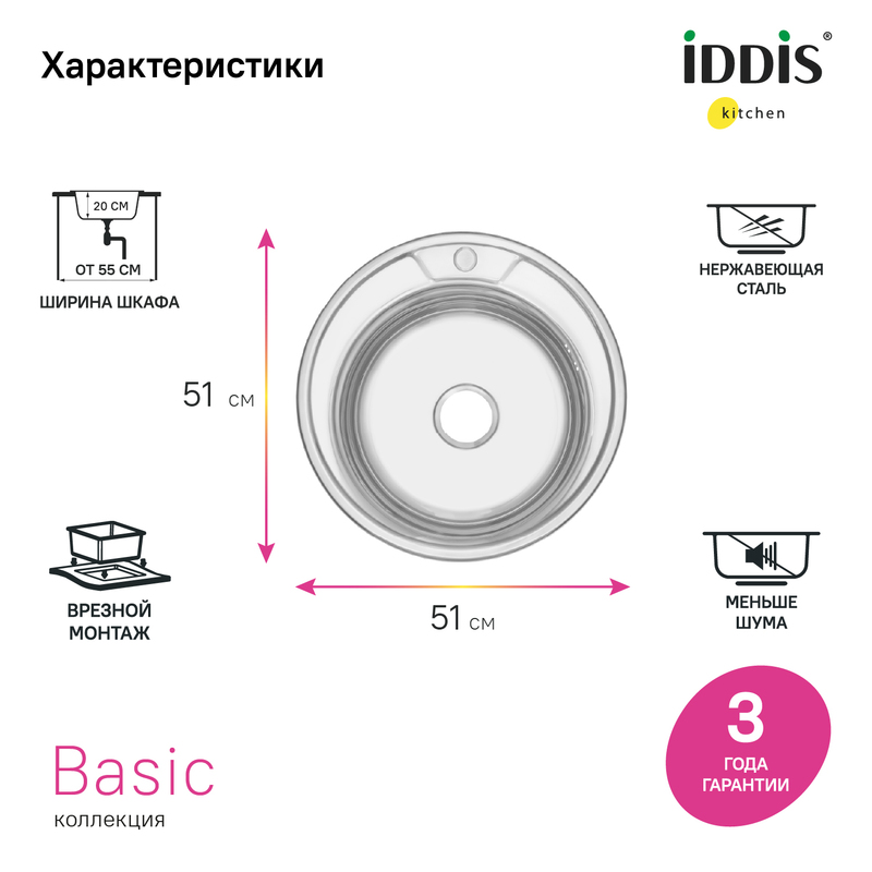 Универсальная коллекция моек Basic – грамотное решение для оснащения эффективного кухонного пространства. Любая мойка коллекции отлично подходит для выполнения повседневных задач на современной кухне и гармонично сочетается с кухонной утварью и аксессуарами. Круглая модель диаметром 510 мм составит комплект с гарнитурами и тумбами шириной от 55 см. Мойка Basic с полированной поверхностью проходит несколько этапов обработки, что позволяет получить красивый зеркальный блеск. • Мойка IDDIS® изготовлена из нержавеющей стали AISI 201 толщиной 0,6 мм; сталь содержит 16% хрома и 1% никеля, что надежно защищает от коррозии. • Специальное антишумовое покрытие и полимерные накладки на оборотной стороне чаши снижают шум при использовании мойки. • Все необходимое для монтажа в комплекте: крепеж и шаблон для выреза в столешнице, эластичная уплотнительная лента, которая защитит периметр мойки от протечек. Сифон приобретается отдельно. Гарантия на мойку Basic – 3 года. (с) Авторский текст, апрель 2022 г.