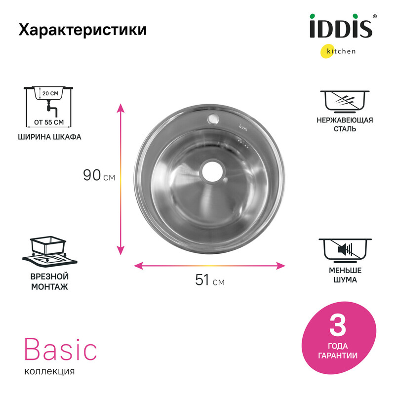 Универсальная мойка Basic – грамотное решение для наполнения эффективного кухонного пространства, отлично подойдет для выполнения повседневных задач на современной кухне. Круглая модель диаметром 510 мм составит комплект с тумбами шириной от 45 см. Матовая сатиновая поверхность мойки Basic гармонирует с различной кухонной утварью и аксессуарами. • Мойка IDDIS® изготовлена из нержавеющей стали AISI 201 толщиной 0,6 мм; сталь содержит 16% хрома и 1% никеля, что надежно защищает от коррозии. • Специальное антишумовое покрытие и полимерные накладки на обороте чаши снижают шум при использовании. • Все необходимое для монтажа в комплекте: крепеж и шаблон для выреза в столешнице, эластичная уплотнительная лента, которая защитит периметр мойки от протечек. Сифон приобретается отдельно. • Идеально сочетается по цвету со смесителями IDDIS® ACEBNFFi05, RULSTLFi05, RULSTL0i05, K05STJ0i05, CUBSTP0i05, K05STL0i05, PURBNPFi05, GRABNFLi05. Гарантия на мойку Basic – 3 года. (с) Авторский текст, апрель 2022 г.