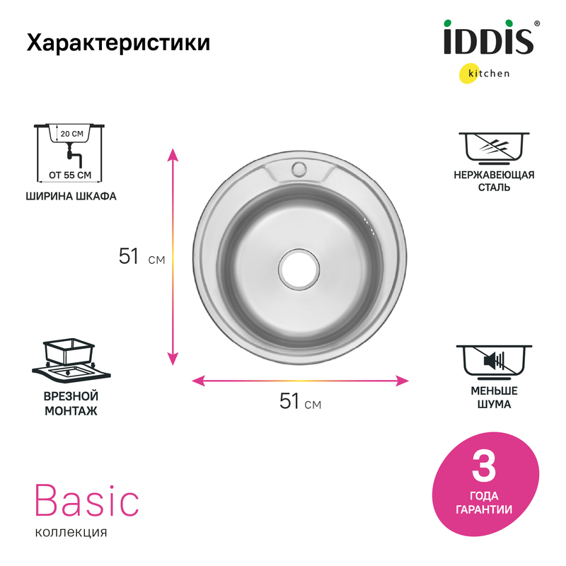 Универсальная мойка Basic – грамотное решение для наполнения эффективного кухонного пространства, отлично подойдет для выполнения повседневных задач на современной кухне. Круглая модель диаметром 510 мм составит комплект с тумбами шириной от 45 см. Матовая сатиновая поверхность мойки Basic гармонирует с различной кухонной утварью и аксессуарами. • Мойка IDDIS® изготовлена из нержавеющей стали AISI 201 толщиной 0,6 мм; сталь содержит 16% хрома и 1% никеля, что надежно защищает от коррозии. • Специальное антишумовое покрытие и полимерные накладки на обороте чаши снижают шум при использовании. • Все необходимое для монтажа в комплекте: крепеж и шаблон для выреза в столешнице, эластичная уплотнительная лента, которая защитит периметр мойки от протечек. Сифон приобретается отдельно. • Идеально сочетается по цвету со смесителями IDDIS® ACEBNFFi05, RULSTLFi05, RULSTL0i05, K05STJ0i05, CUBSTP0i05, K05STL0i05, PURBNPFi05, GRABNFLi05. Гарантия на мойку Basic – 3 года. (с) Авторский текст, апрель 2022 г.
