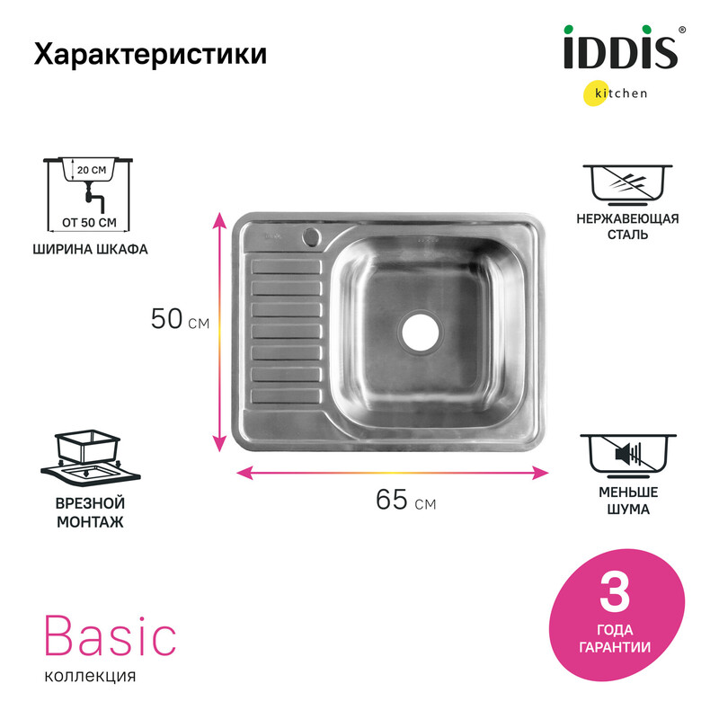 Универсальная мойка Basic – грамотное решение для наполнения эффективного кухонного пространства, отлично подойдет для выполнения повседневных задач на современной кухне. Прямоугольная модель составит комплект с тумбами шириной от 50 см. Крыло слева удобно использовать для сушки столовых приборов. Матовая сатиновая поверхность мойки гармонирует с различной кухонной утварью и аксессуарами. • Изготовлена из качественной нержавеющей стали AISI 201 толщиной 0,6 мм; сталь содержит 16% хрома и 1% никеля, что надежно защищает от коррозии. • Специальное антишумовое покрытие и полимерные накладки на обороте чаши снижают шум при использовании. • Все необходимое для монтажа в комплекте: крепеж и шаблон для выреза в столешнице, эластичная уплотнительная лента, которая защитит периметр мойки от протечек. Сифон приобретается отдельно. • Идеально сочетается по цвету со смесителями IDDIS® ACEBNFFi05, RULSTLFi05, RULSTL0i05, K05STJ0i05, CUBSTP0i05, K05STL0i05, PURBNPFi05, GRABNFLi05. Гарантия на мойку Basic – 3 года. (с) Авторский текст, апрель 2022 г.