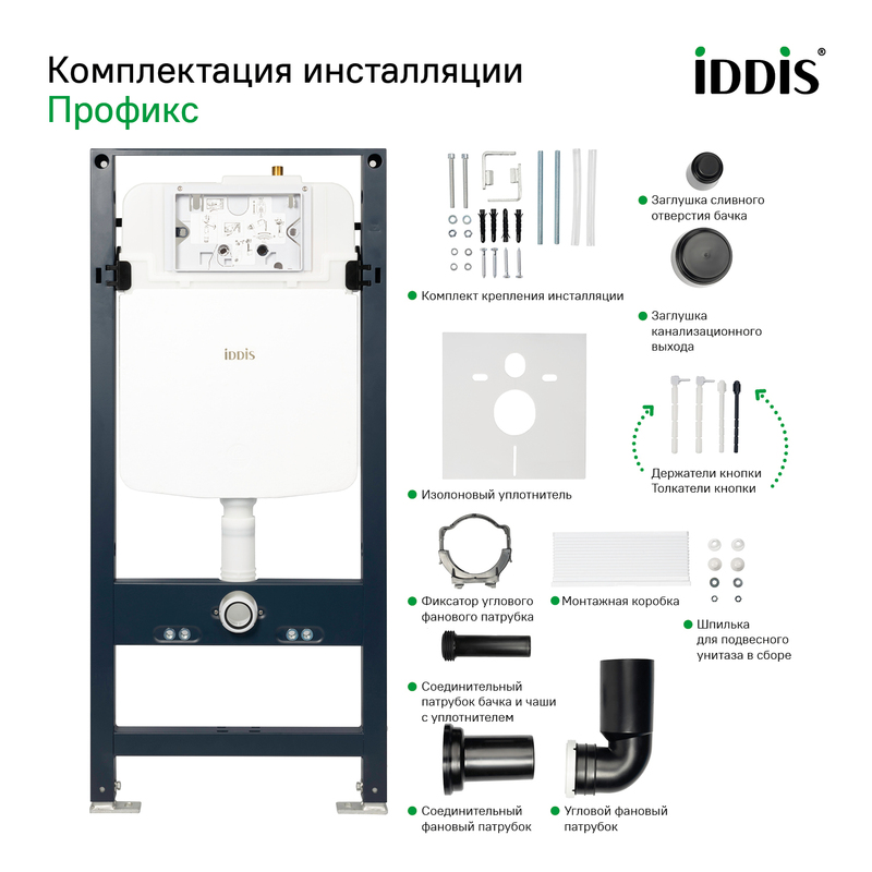 Готовый комплект сантехники 3 в 1 для обустройства туалетной комнаты. Состоит из подвесного унитаза Calipso (CALRNSEi25), инсталляции Profix (PRO0000i32) с двухуровневой арматурой и черной матовой клавиши смыва (OPH10B0i77). В комплекте есть всё необходимое для удобной установки. Так выгоднее и удобнее, чем покупать всё по отдельности. • Унитаз Calipso современного дизайна имеет безободковую конструкцию чаши и сиденье с микролифтом и функцией быстрого снятия, что делает его гигиеничным и удобным в уборке. Идеально впишется в любой интерьер благодаря компактным размерам. • Ультратонкое сиденье из дюропласта на ощупь напоминает керамику, устойчиво к царапинам, надолго остается белоснежным и чистым. • Надежная цельная стальная рама инсталляции имеет возможность регулировки по высоте и подходит для монтажа в любых, в том числе узких, пространствах. Гарантия на унитазы IDDIS® – 25 лет, на инсталляции – 10 лет, на клавиши смыва – 3 года. (с) Авторский текст, июнь 2024 г.
