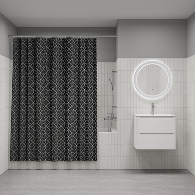 Текстильная штора для ванной черного цвета с белым геометричным принтом в стиле ар-деко. • Изготовлена из износостойкого полиэстера с усиленной водонепроницаемой пропиткой. При попадании на ткань вода не впитывается, а скатывается каплями, даже при сильном напоре воды. • В комплекте 12 колец С-формы из прозрачного пластика. • По верхнему краю расположены 12 прозрачных пластиковых люверсов. • Штора имеет утяжеляющую нить по нижнему краю, которая позволяет избежать задирания ткани. • Легко ухаживать: шторку для ванной комнаты можно стирать в стиральной машине в деликатном режиме и гладить утюгом на минимальной температуре. Гарантия на текстильные аксессуары IDDIS® – 1 год. (с) Авторский текст, август 2023 г.
