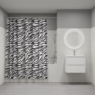 Текстильная штора для ванной черно-белого цвета с анималистичным принтом в виде расцветки зебры. • Изготовлена из износостойкого полиэстера с усиленной водонепроницаемой пропиткой. При попадании на ткань вода не впитывается, а скатывается каплями, даже при сильном напоре воды. • В комплекте 12 колец С-формы из прозрачного пластика. • По верхнему краю расположены 12 прозрачных пластиковых люверсов. • Штора имеет утяжеляющую нить по нижнему краю, которая позволяет избежать задирания ткани. • Легко ухаживать: шторку для ванной комнаты можно стирать в стиральной машине в деликатном режиме и гладить утюгом на минимальной температуре. Гарантия на текстильные аксессуары IDDIS® – 1 год. (с) Авторский текст, август 2023 г.