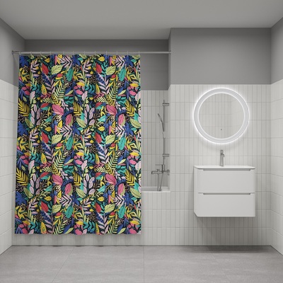 Текстильная штора для ванной с ярким разноцветным растительным принтом на черном фоне. • Изготовлена из износостойкого полиэстера с усиленной водонепроницаемой пропиткой. При попадании на ткань вода не впитывается, а скатывается каплями, даже при сильном напоре воды. • В комплекте 12 колец С-формы из прозрачного пластика. • По верхнему краю расположены 12 прозрачных пластиковых люверсов. • Штора имеет утяжеляющую нить по нижнему краю, которая позволяет избежать задирания ткани. • Легко ухаживать: шторку для ванной комнаты можно стирать в стиральной машине в деликатном режиме и гладить утюгом на минимальной температуре. Гарантия на текстильные аксессуары IDDIS® – 1 год. (с) Авторский текст, август 2023 г.
