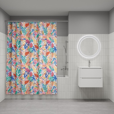 Текстильная штора для ванной белого цвета с ярким разноцветным растительным принтом. • Изготовлена из износостойкого полиэстера с усиленной водонепроницаемой пропиткой. При попадании на ткань вода не впитывается, а скатывается каплями, даже при сильном напоре воды. • В комплекте 12 колец С-формы из прозрачного пластика. • По верхнему краю расположены 12 прозрачных пластиковых люверсов. • Штора имеет утяжеляющую нить по нижнему краю, которая позволяет избежать задирания ткани. • Легко ухаживать: шторку для ванной комнаты можно стирать в стиральной машине в деликатном режиме и гладить утюгом на минимальной температуре. Гарантия на текстильные аксессуары IDDIS® – 1 год. (с) Авторский текст, август 2023 г.
