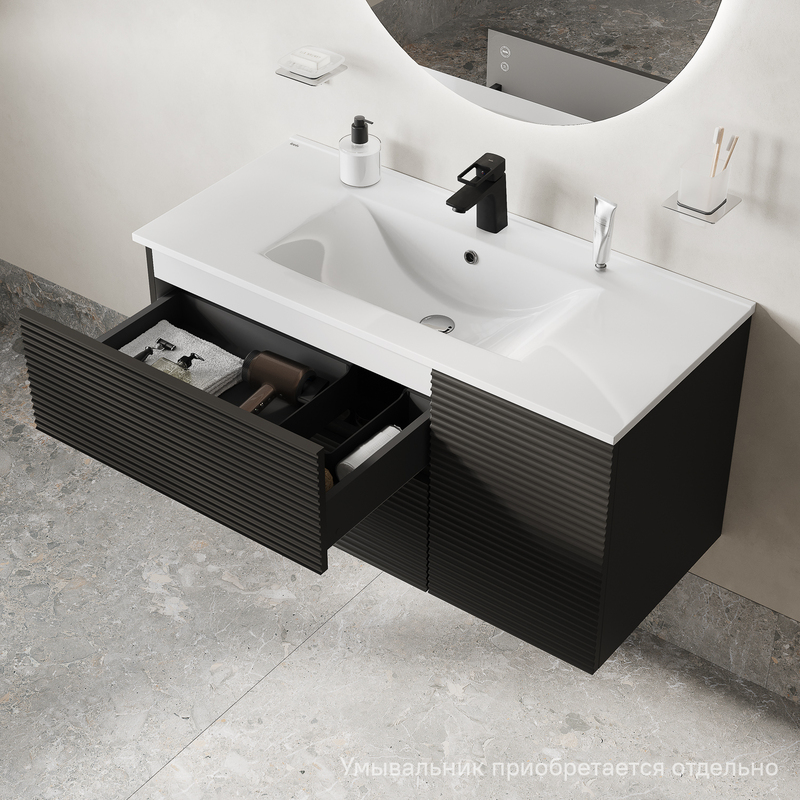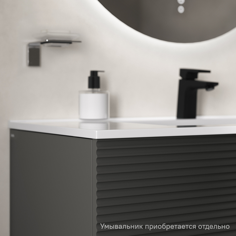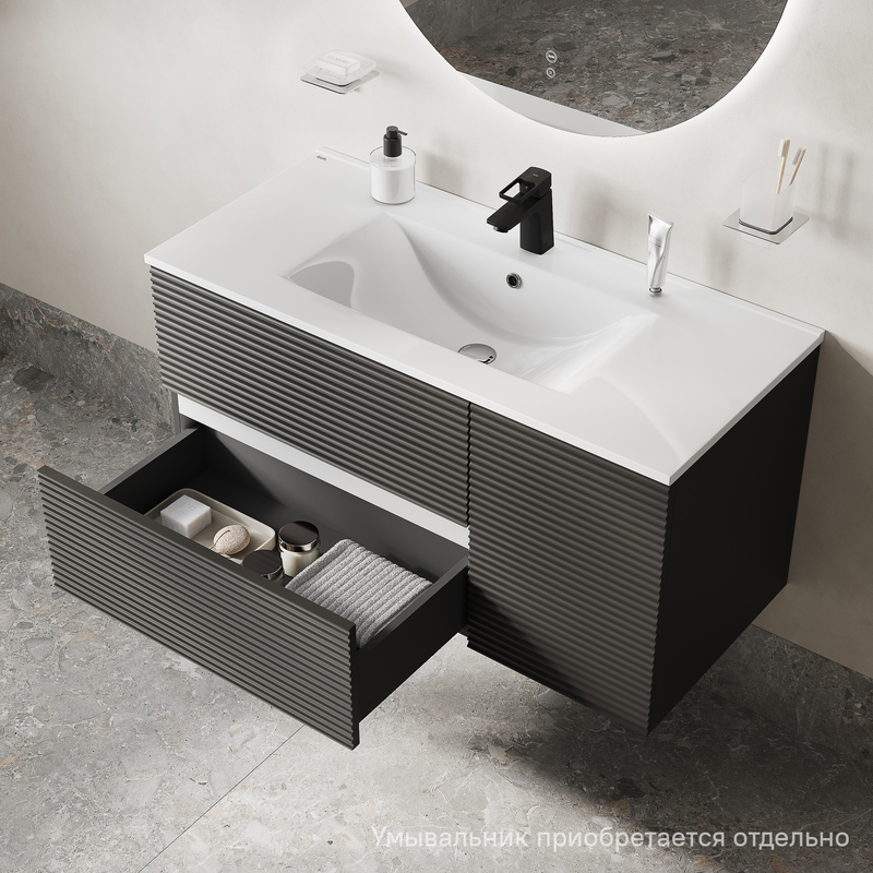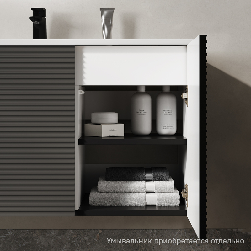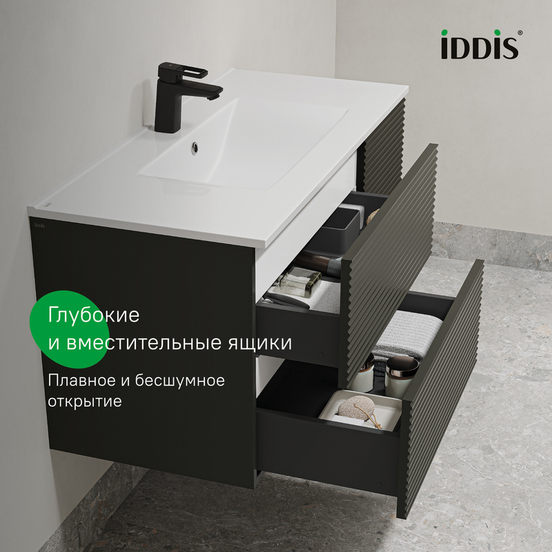 Вместительная подвесная тумба для ванной комнаты Bild с выдвижными ящиками и полками – красивый дизайн с трендовой горизонтальной фрезеровкой в сочетании с популярным темно-серым цветом, удобством и практичностью. Без умывальника в комплекте (подходит умывальник IDDIS® арт. 0131000i28). Материал фасада – МДФ с покрытием ПВХ-пленкой. Она разработана для использования в помещениях с высокой влажностью и сохранит первоначальный вид мебели надолго (при должном уходе). Материал боковин – ЛДСП. Два ящика с направляющими скрытого монтажа с доводчиком Hettich и полки с распашной дверкой. Фурнитура рассчитана на 30 000 открываний – это более 10 лет исправной работы. Современный механизм открытия Push-to-Open – открывается нажатием на фасад. В комплекте крепеж для монтажа тумбы. Сифон приобретается отдельно. Гарантия на мебель IDDIS® – 3 года. (с) Авторский текст, март 2025 г.