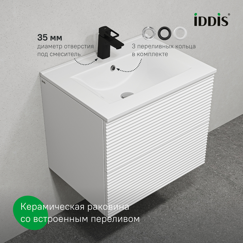 Компактная подвесная тумба для ванной комнаты Bild с умывальником и выдвижными ящиками – красивый дизайн с трендовой горизонтальной фрезеровкой в сочетании с универсальным белым цветом, удобством и практичностью. • Материал фасадов – МДФ с покрытием ПВХ-пленкой. Она разработана для использования в помещениях с высокой влажностью и сохранит первоначальный вид мебели надолго (при должном уходе). Материал боковин – МДФ. • Керамический умывальник с высоким бортом и большой вместительной чашей в комплекте. Удобен для гигиенических и хозяйственных нужд. • Два ящика с направляющими скрытого монтажа Hettich. Фурнитура рассчитана на более 10 лет исправной работы. • Современный механизм открытия Push-to-Open – открывается нажатием на фасад. • В комплекте крепеж для монтажа тумбы. • Сифон приобретается отдельно. Гарантия на мебель IDDIS® – 3 года, на умывальник – 5 лет. (с) Авторский текст, октябрь 2024 г.