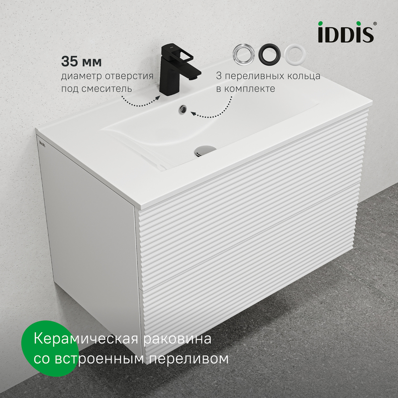 Вместительная подвесная тумба для ванной комнаты Bild с умывальником и выдвижными ящиками – красивый дизайн с трендовой горизонтальной фрезеровкой в сочетании с универсальным белым цветом, удобством и практичностью. • Материал фасадов – МДФ с покрытием ПВХ-пленкой. Она разработана для использования в помещениях с высокой влажностью и сохранит первоначальный вид мебели надолго (при должном уходе). Материал боковин – МДФ. • Керамический умывальник с высоким бортом и большой вместительной чашей в комплекте. Удобен для гигиенических и хозяйственных нужд. • Два ящика с направляющими скрытого монтажа Hettich. Фурнитура рассчитана на более 10 лет исправной работы. • Современный механизм открытия Push-to-Open – открывается нажатием на фасад. • В комплекте крепеж для монтажа тумбы. • Сифон приобретается отдельно. Гарантия на мебель IDDIS® – 3 года, на умывальник – 5 лет. (с) Авторский текст, октябрь 2024 г.