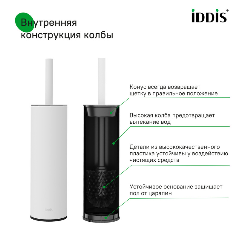 Напольный ерш в белом матовом цвете из коллекции Optima Home с высоким корпусом и черной щеткой – практичное решение для оформления отдельной туалетной комнаты и совмещенного санузла. Внутри конструкции предусмотрена защитная колба из прочного ABS-пластика, которая не впитывает запахи, легко вынимается и моется. Благодаря нейтральному стилю и современному дизайну аксессуары из коллекции Optima Home безупречно вписываются в любой интерьер. Их можно гармонично сочетать друг с другом и с другими элементами оформления, создавая удобное и функциональное пространство для комфортной жизни. • Дополнительная накладка на крышке обеспечивает надежное закрытие без риска повреждения поверхности. • Щетка ершика практичного черного цвета не царапает поверхность унитаза и обладает высокой износостойкостью, что делает ее устойчивой к агрессивным чистящим средствам. • Корпус из нержавеющей стали не подвержен коррозии и прослужит дольше во влажном помещении. Гарантия на напольный ерш IDDIS® – 5 лет. (с) Авторский текст, сентябрь 2024 г.