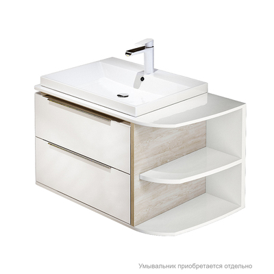 Тумба для ванной комнаты, подвесная. Размеры: 479х800х450 мм (ДхШхВ). Фасад МДФ 16 мм в эмали, боковины ЛДСП белый глянец/под дерево. Два выдвижных ящика с механизмом плавного доведения, 2 открытые закругленные полки. Перекатной организатор в нижнем ящике. Упаковка: картон, пленка, пенопластовые уголки. Подходит умывальник 0066000i28.