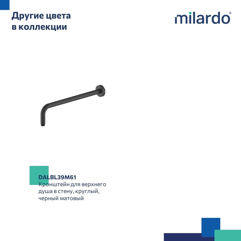 Г-образный настенный кронштейн Дейл (Dale) для верхней душевой лейки. Модель совместима с любыми хромированными верхними лейками Milardo®, а также с лейками других производителей с подключением G 1/2. Кронштейн подходит для душевой зоны практически любого размера и позволяет оценить все преимущества тропического душа. • Кронштейн надежно фиксирует лейку в необходимом положении. Место его крепления закрывается круглым декоративным отражателем для сохранения привлекательного внешнего вида. • Хромированное покрытие кронштейна Milardo® оптимальной толщины не подвержено образованию трещин и царапин (при должном уходе). • Гарантия на душевые аксессуары Milardo® – 1 год. (с) Авторский текст, февраль 2024 г.