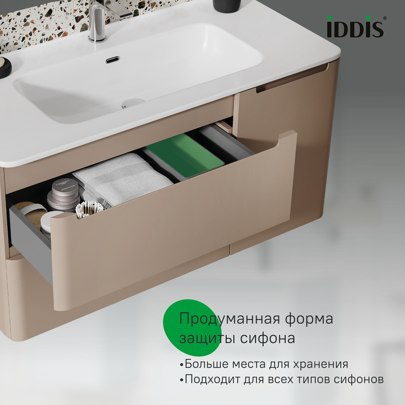 Вместительная подвесная тумба с плоским умывальником Edifice в теплом оттенке капучино – воплощение современного минимализма. Мягкие линии корпуса в сочетании с удобными интегрированными ручками выглядят свежо и актуально. Смотрится аккуратно, легко и не усложняет процесс уборки в ванной благодаря подвесной конструкции. • В комплекте умывальник (арт. 0101000i28) из качественного фарфора. Он отличается высокой прочностью и прост в уходе: не задерживает загрязнения и неприятные запахи, надолго сохраняя первозданную белизну. • Два выдвижных ящика закрываются плавно и бесшумно благодаря высококачественным скрытым направляющим с доводчиками немецкого производства. • Надежные крепления рассчитаны на большой вес и позволяют равномерно распределять нагрузку. • Фурнитура рассчитана на 30 000 открываний, что составляет более 10 лет исправной работы. Гарантия на мебель IDDIS® – 3 года. (с) Авторский текст, август 2023 г.