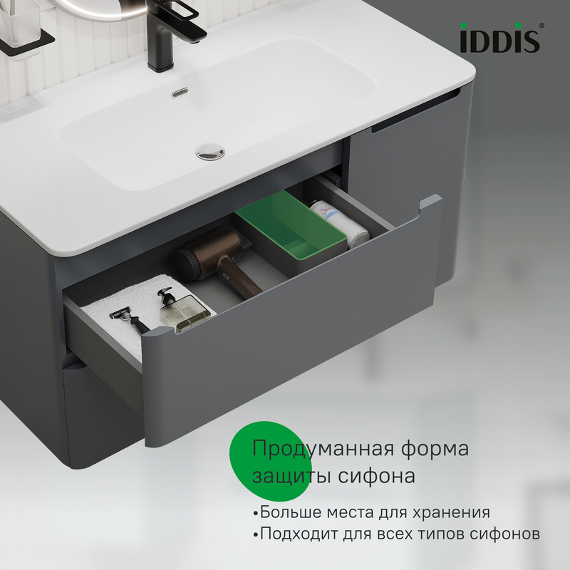Вместительная подвесная тумба с плоским умывальником Edifice стильного темно-серого цвета – воплощение современного минимализма. Мягкие линии корпуса в сочетании с удобными интегрированными ручками выглядят свежо и актуально. Смотрится аккуратно, легко и не усложняет процесс уборки в ванной благодаря подвесной конструкции. Умывальник приобретается отдельно (подходит умывальник IDDIS® арт. 0101000i28). • Два выдвижных ящика закрываются плавно и бесшумно благодаря высококачественным скрытым направляющим с доводчиками немецкого производства. • Надежные крепления рассчитаны на большой вес и позволяют равномерно распределять нагрузку. • Фурнитура рассчитана на 30 000 открываний, что составляет более 10 лет исправной работы. Гарантия на мебель IDDIS® – 3 года. (с) Авторский текст, август 2023 г.