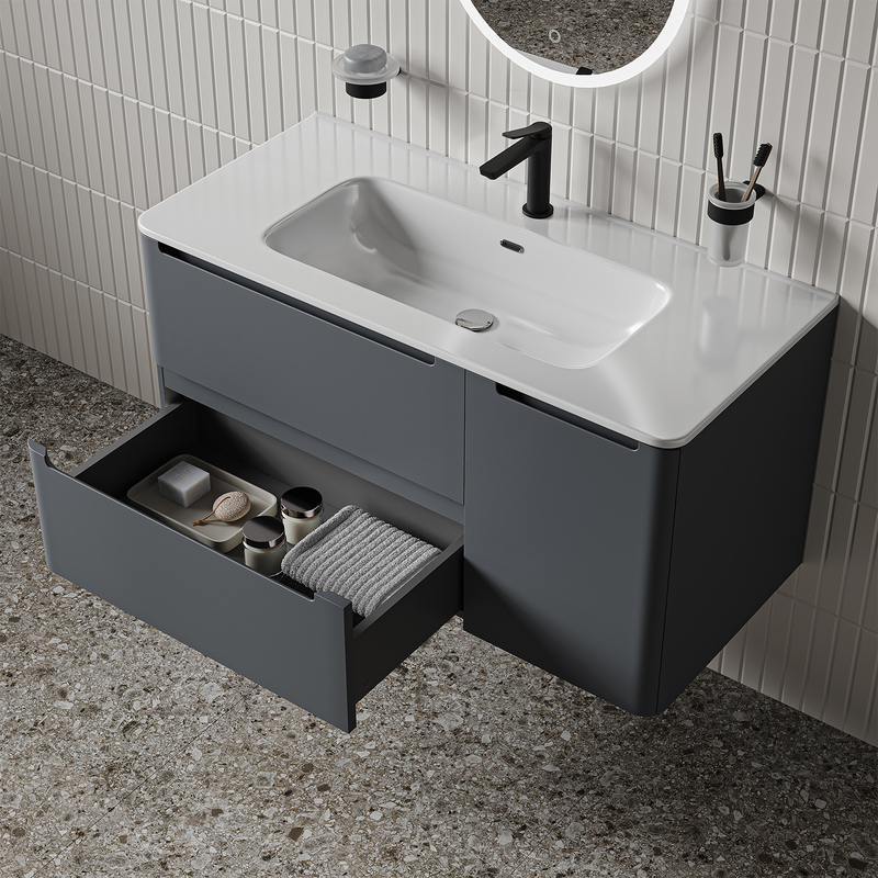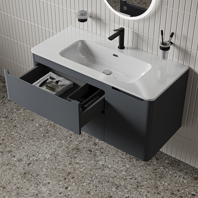| Уникальные преимущества: | Интегрированные ручки, плоский умывальник, ящики с механизмом плавного доведения |