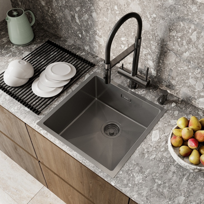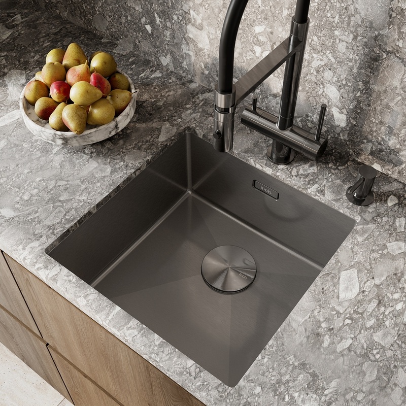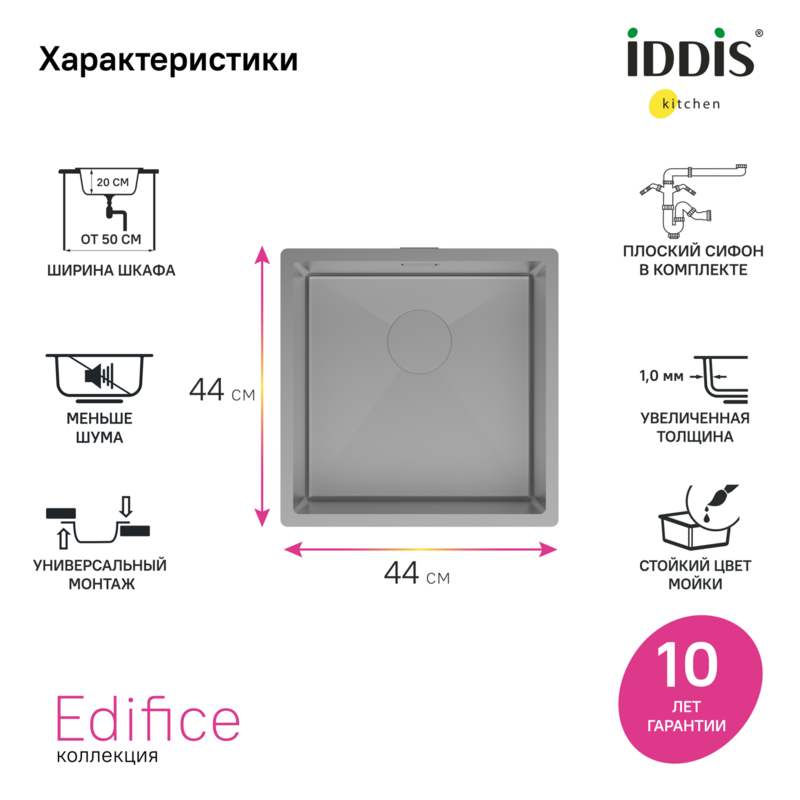 Графитовая мойка Edifice перевернет представление о привычных мойках своим современным дизайном и эргономичностью, достойными кухни шеф-повара. Для шкафа от 50 см. Глубина 20 см. Произведена ручным способом – у нее идеальная геометрия с малым радиусом скругления углов, что увеличивает рабочее пространство: удобно мыть много посуды, крупные предметы. Декоративная накладка на сливное отверстие – придает аккуратный вид, не блокируя смыв. • В комплекте все необходимое: 2 набора крепежей, стильный выпуск, плоский сифон, который занимает меньше места и освобождает полезное пространство. Универсальный монтаж: врезной (вырез под мойку составляет 420х420хR10 мм) и подстольный (вырез под мойку составляет 400х400 мм). • Мойка из качественной нержавеющей стали AISI 304 толщиной 1 мм; сталь содержит 18% хрома и 8% никеля, что надежно защищает ее от коррозии. Стойкая к износу, выдерживает различные t, легко моется, долго служит. При правильном уходе надолго сохранит привлекательный внешний вид. • Специальные ребра-уклоны. • Антишумовое покрытие и полимерные накладки на обороте снижают шум при использовании. • Дополните ее полезными аксессуарами для кухни: дозатором SDIGM01i59 и колландером KOL23GMi59 в тон мойки. Гарантия на мойку – 10 лет, на выпуск и сифон – 1 год. * В зависимости от партии внешний вид мойки и ее комплектация могут незначительно отличаться. (с) Авторский текст, декабрь 2025 г.