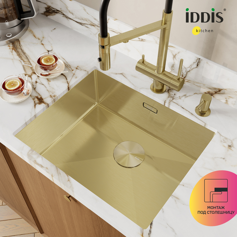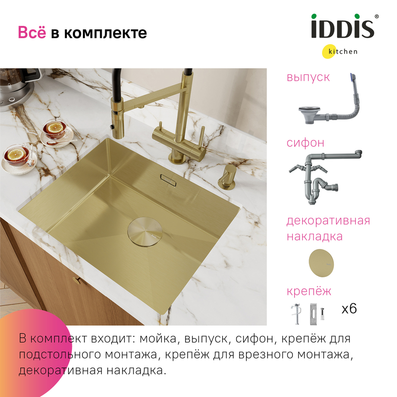 Вместительная золотая мойка Edifice перевернет представление о привычных кухонных мойках благодаря современному дизайну и эргономичности, достойных кухни шеф-повара. Для шкафа шириной от 60 см. Глубина 20 см. Произведена ручным способом для сохранения толщины стального листа. Идеальная геометрия с малым скруглением углов увеличивает рабочее пространство: удобно мыть много посуды и крупные предметы. • В комплекте все необходимое: 2 набора крепежей, выпуск, плоский сифон, который занимает меньше места и освобождает полезное пространство. Универсальный монтаж: врезной (вырез под мойку составляет 420х520хR10 мм) и подстольный (вырез под мойку составляет 400х500 мм). • Мойка толщиной 1 мм выполнена из качественной нержавеющей стали AISI 304; сталь содержит 18% хрома и 8% никеля, что надежно защищает ее от коррозии. Стойкая к износу, выдерживает различные t, легко моется, долго служит. При правильном уходе надолго сохранит привлекательный внешний вид. • Антишумовое покрытие и полимерные накладки на оборотной стороне снижают шум при использовании. • Специальные ребра-уклоны. • Дополните ее полезными аксессуарами для кухни: дозатором SDIMG00i59 и колландером KOL23MGi59 в тон мойки. Гарантия на мойку – 10 лет, на выпуск и сифон – 1 год. (с) Авторский текст, декабрь 2025 г.