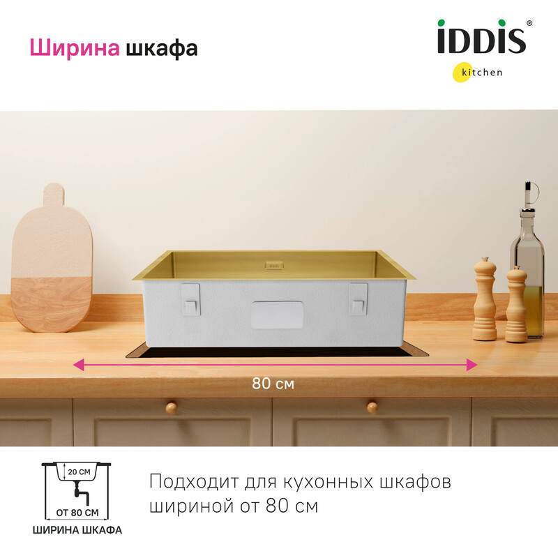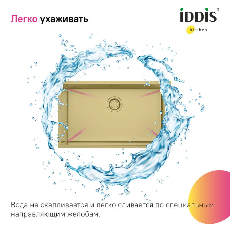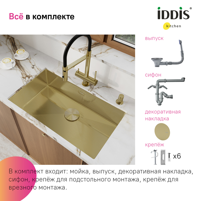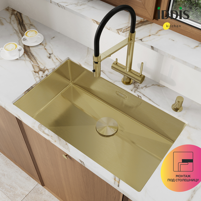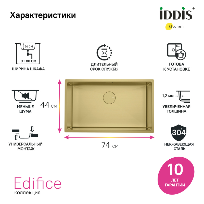 Большая золотая мойка Edifice перевернет представление о привычных мойках благодаря дизайну и эргономичности, достойных кухни шеф-повара. За счет нестандартного размера 700х400 мм ее рабочая поверхность почти равна двум обычным мойкам. Для шкафа шириной от 80 см. Глубина 20 см. Произведена ручным способом для сохранения толщины стального листа. Идеальная геометрия с малым скруглением углов увеличивает рабочее пространство: удобно мыть много посуды и крупные предметы. • В комплекте все необходимое: 2 набора крепежей, выпуск, плоский сифон, который занимает меньше места и освобождает полезное пространство. Универсальный монтаж: врезной (вырез под мойку составляет 420х720хR10 мм) и подстольный (вырез под мойку составляет 700х500 мм). • Мойка из качественной нержавеющей стали AISI 304 толщиной 1,2 мм; сталь содержит 18% хрома и 8% никеля, что надежно защищает ее от коррозии. Стойкая к износу, выдерживает различные t, легко моется, долго служит. При правильном уходе надолго сохранит привлекательный внешний вид. • Специальные ребра-уклоны. • Антишумовое покрытие и накладки на обороте снижают шум при использовании. • Дополните ее полезными аксессуарами для кухни: дозатором SDIMG00i59 и колландером KOL23MGi59 в тон мойки. Гарантия на мойку – 10 лет, на выпуск и сифон – 1 год. (с) Авторский текст, декабрь 2025 г.