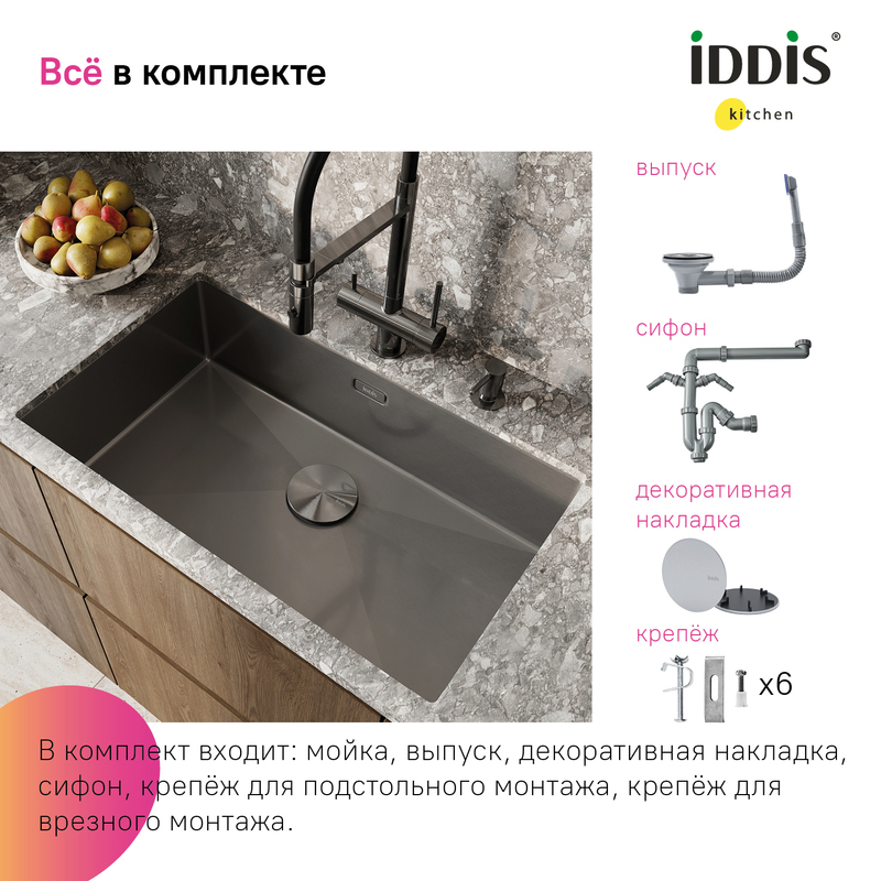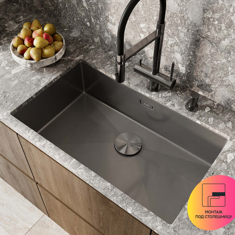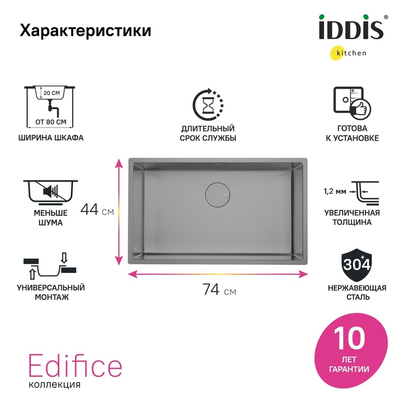 Широкая мойка Edifice в цвете графит перевернет представление о привычных мойках благодаря современному дизайну и эргономичности, достойных кухни шеф-повара. За счет нестандартного размера 700х400 мм ее рабочая поверхность почти равна 2 обычным мойкам. Для шкафа шириной от 80 см. Глубина 20 см. Произведена ручным способом для сохранения толщины стального листа. Идеальная геометрия с малым скруглением углов увеличивает рабочее пространство: удобно мыть много посуды и крупные предметы. • В комплекте все необходимое: 2 набора крепежей, выпуск, плоский сифон, который занимает меньше места и освобождает полезное пространство. Универсальный монтаж: врезной (вырез под мойку составляет 420х720хR10 мм) и подстольный (вырез под мойку составляет 700х500 мм). • Мойка из качественной нержавеющей стали AISI 304 толщиной 1,2 мм; сталь содержит 18% хрома и 8% никеля, что надежно защищает ее от коррозии. Стойкая к износу, выдерживает различные t, легко моется, долго служит. При правильном уходе надолго сохранит привлекательный внешний вид. • Специальные ребра-уклоны. • Антишумовое покрытие и накладки на обороте снижают шум при использовании. • Дополните ее полезными аксессуарами для кухни: дозатором SDIGM01i59 и колландером KOL23GMi59 в тон мойки. Гарантия на мойку – 10 лет, на выпуск и сифон – 1 год. (с) Авторский текст, декабрь 2025 г.