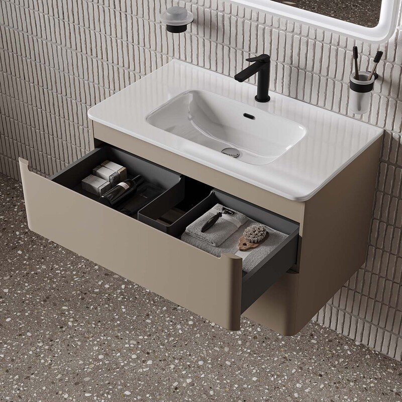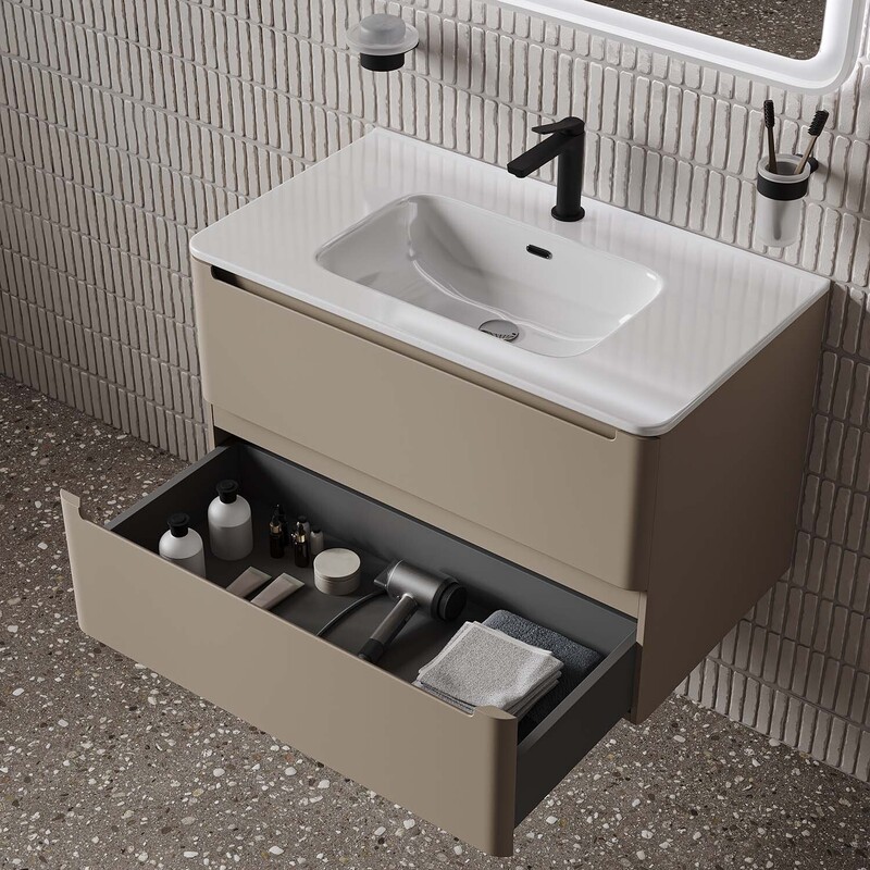 Подвесная тумба с плоским умывальником Edifice в теплом оттенке капучино – воплощение современного минимализма. Мягкие линии корпуса в сочетании с удобными интегрированными ручками выглядят свежо и актуально. Смотрится аккуратно, легко и не усложняет процесс уборки в ванной благодаря подвесной конструкции. • В комплекте умывальник (арт. 0108000i28) из качественного фарфора. Он отличается высокой прочностью и прост в уходе: не задерживает загрязнения и неприятные запахи, надолго сохраняя первозданную белизну. • Два выдвижных ящика закрываются плавно и бесшумно благодаря высококачественным скрытым направляющим с доводчиками немецкого производства. • Надежные крепления рассчитаны на большой вес и позволяют равномерно распределять нагрузку. • Фурнитура рассчитана на 30 000 открываний, что составляет более 10 лет исправной работы. Гарантия на мебель IDDIS® – 3 года. (с) Авторский текст, август 2023 г.