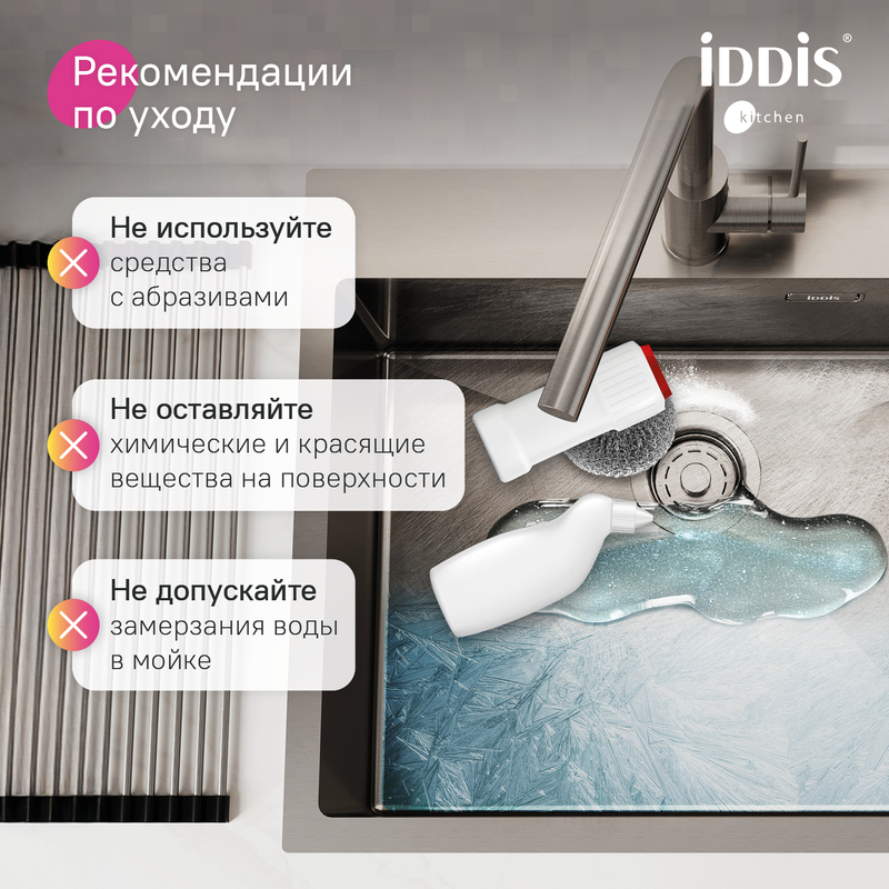 Мойка Haze отличается современным дизайном и ручным методом производства, что позволяет добиться идеальной геометрии – малый радиус скругления углов увеличивает рабочее пространство без «слепых» зон. Удобно разместить много посуды и мыть крупные предметы. Подходит для шкафа от 60 см. Глубина 20 см. • Подходит для врезного монтажа, подстольный монтаж не предусмотрен. Вырез под мойку составляет 570х490 мм. • В комплекте: крепеж, выпуск, плоский сифон (занимает меньше места, освобождая полезное пространство). • Мойка толщиной 1 мм выполнена из качественной нержавеющей стали AISI 304; сталь содержит 18% хрома и 8% никеля, что надежно защищает ее от коррозии. Стойкая к износу, выдерживает различные t, легко моется, долго служит. При правильном уходе надолго сохранит привлекательный внешний вид. • Специальные ребра-уклоны. • Специальное антишумовое покрытие и накладки на обороте чаши снижают шум при использовании. • Дополните ее полезным аксессуаром для кухни: колландером KOL23S0i59 в тон мойки. Гарантия на мойки IDDIS® – 15 лет, на выпуск и сифон – 1 год. (с) Авторский текст, декабрь 2025 г.