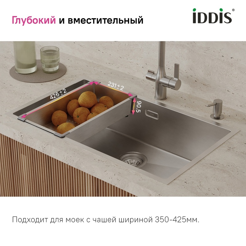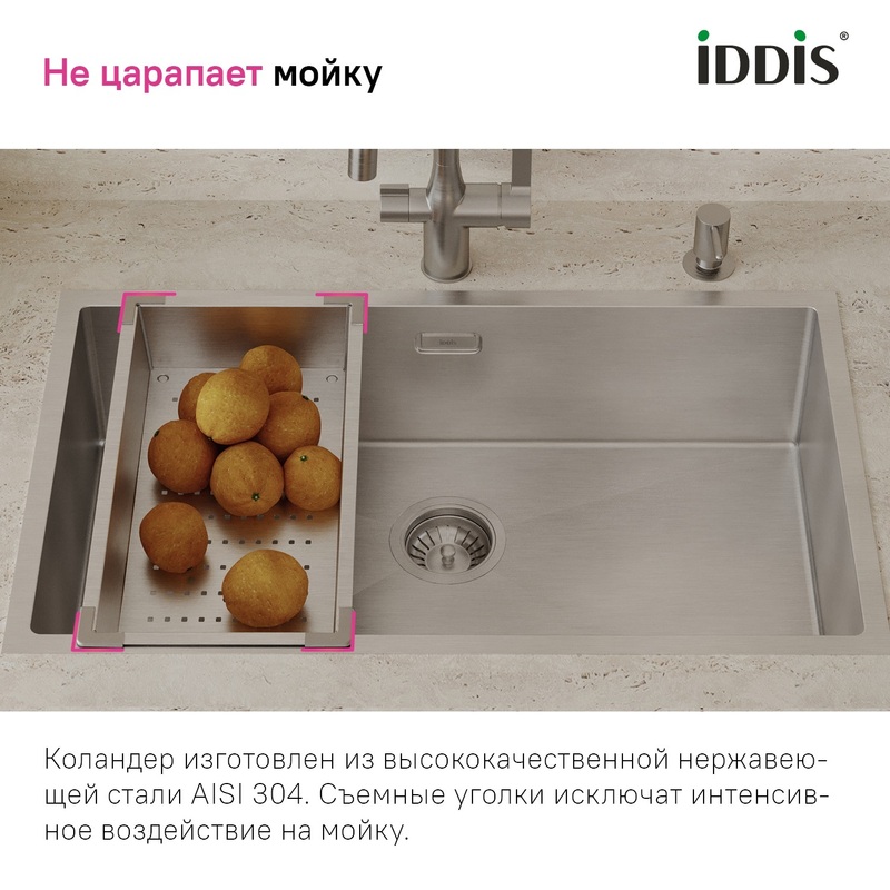 Коландер – стильный и практичный кухонный аксессуар в цвете сатин, дает новые возможности для дизайнерских и функциональных решений на кухне. Отверстия на дне позволяют использовать его как дополнительную рабочую поверхность: для разморозки и хранения продуктов, сушки посуды и столовых приборов, мытья овощей и фруктов. • Изготовлен из высококачественной нержавеющей стали AISI 304. При правильном уходе надолго сохранит привлекательный внешний вид. • Круглые ножки из ABS-пластика позволяют ставить его на дно мойки или стол, не перекрывая отверстия. • Не царапает мойку – в комплекте съемные защитные уголки из серого ABS-пластика. • Произведен по особой ручной технологии, что позволяет добиться идеальной геометрии – малый радиус закругления углов увеличивает и без того вместительное рабочее пространство. • Подходит к мойкам с длиной чаши от 40 см. Отлично сочетается по цвету с сатиновыми мойками, смесителями и аксессуарами. Гарантия на кухонные аксессуары IDDIS® – 2 года. (с) Авторский текст, март 2024 г.