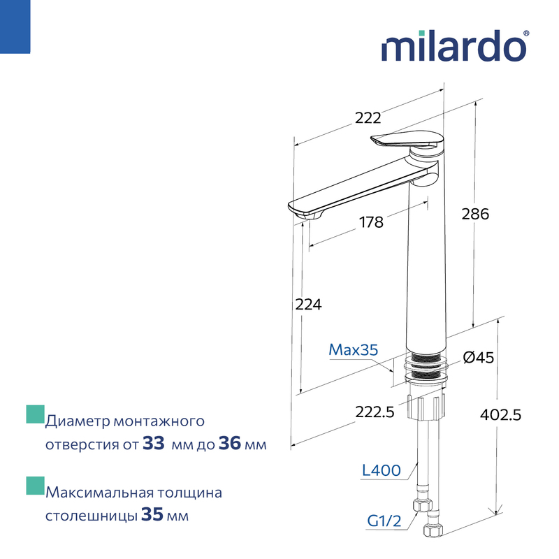 Коллекция Leap сочетает в себе угловатые формы с классическим хромированным покрытием. Высокий смеситель (286 мм) для умывальника подходит для установки с накладными раковинами-чашами. Ручка смесителя слегка приподнята, чтобы сделать регулировку потока еще более удобной. В комплекте смесителя для настольного умывальника гибкая подводка и крепеж. • Качественный механизм смешивания воды смесителя Milardo® рассчитан на более чем 70 000 циклов работы – это не менее 15 лет эксплуатации семьей из трех человек. • Оптимальная толщина никель-хромового покрытия защищает смеситель от образования трещин и сколов, продлевает срок его службы. • Встроенный аэратор легко извлекается из корпуса смесителя с помощью обычной монетки, что значительно упрощает его очистку. • Гарантия на смеситель Milardo® – 7 лет, на картридж – 3 года. (с) Авторский текст, февраль 2026 г.