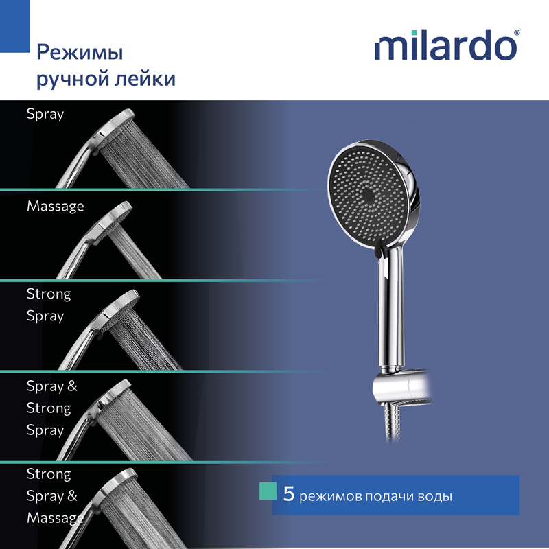 | Названия режимов лейки: | Spray, Massage, Mist, Spray & Massage, Spray & Mist |