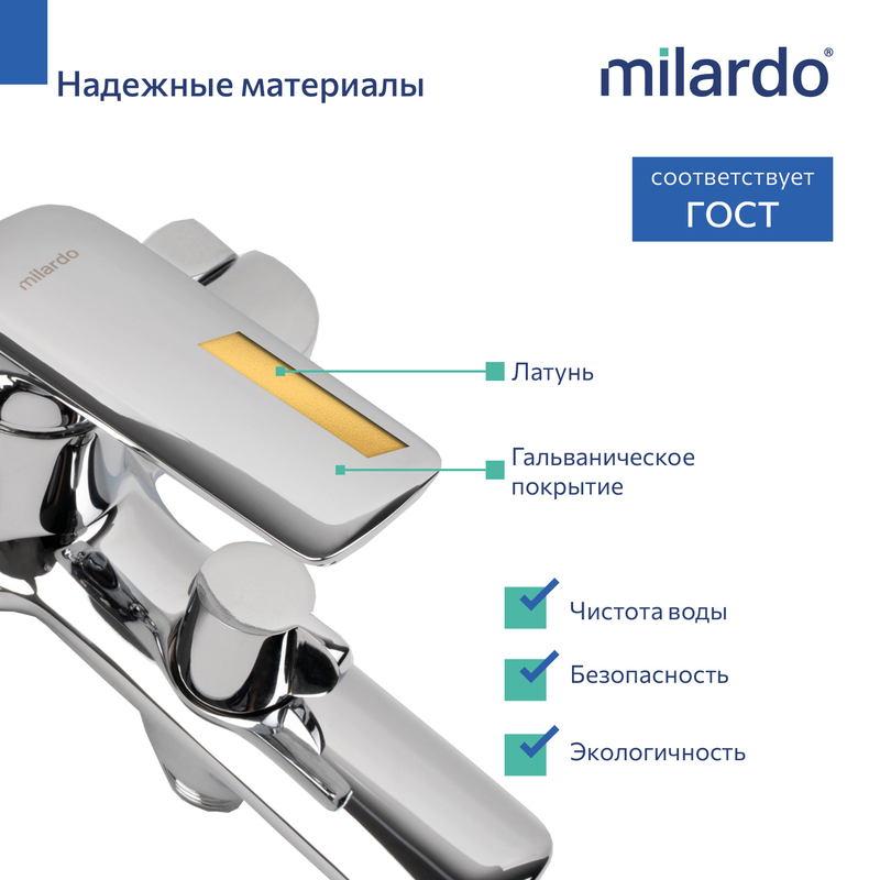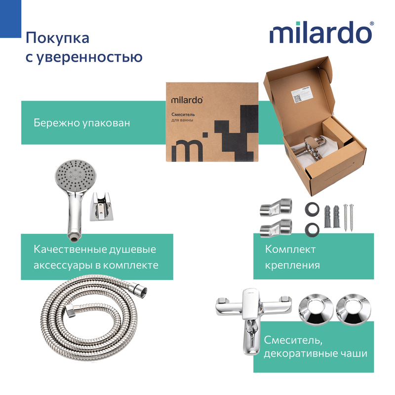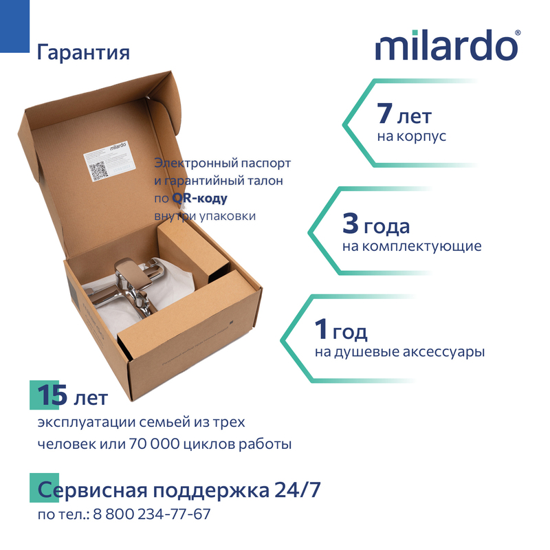 Коллекция Макс (Maks) — это гармония классических округлых очертаний и простой симметрии прямых линий. Что делает дизайн любого помещения уютным и гостеприимным. Излив смесителя для ванны эстетично интегрирован в корпус, вода из него будет поступать под комфортным углом. Смеситель можно установить в зоне душевого ограждения или над ванной. • Качественный механизм смешивания воды смесителя Milardo® рассчитан на более чем 70 000 циклов работы – это не менее 15 лет эксплуатации семьей из трех человек. • Поворотный дивертор работает при любом давлении воды, переключая поток воды с излива на трехрежимную душевую лейку. ПВХ-шланг (1,5 м) в оплетке из нержавеющей стали и крепеж идут в комплекте. • Оптимальная толщина никель-хромового покрытия защищает смеситель от образования трещин и сколов, продлевает срок его службы. • Гарантия на смеситель Milardo® – 7 лет, на картридж – 3 года, на душевые аксессуары – 1 год. (с) Авторский текст, февраль 2026 г.