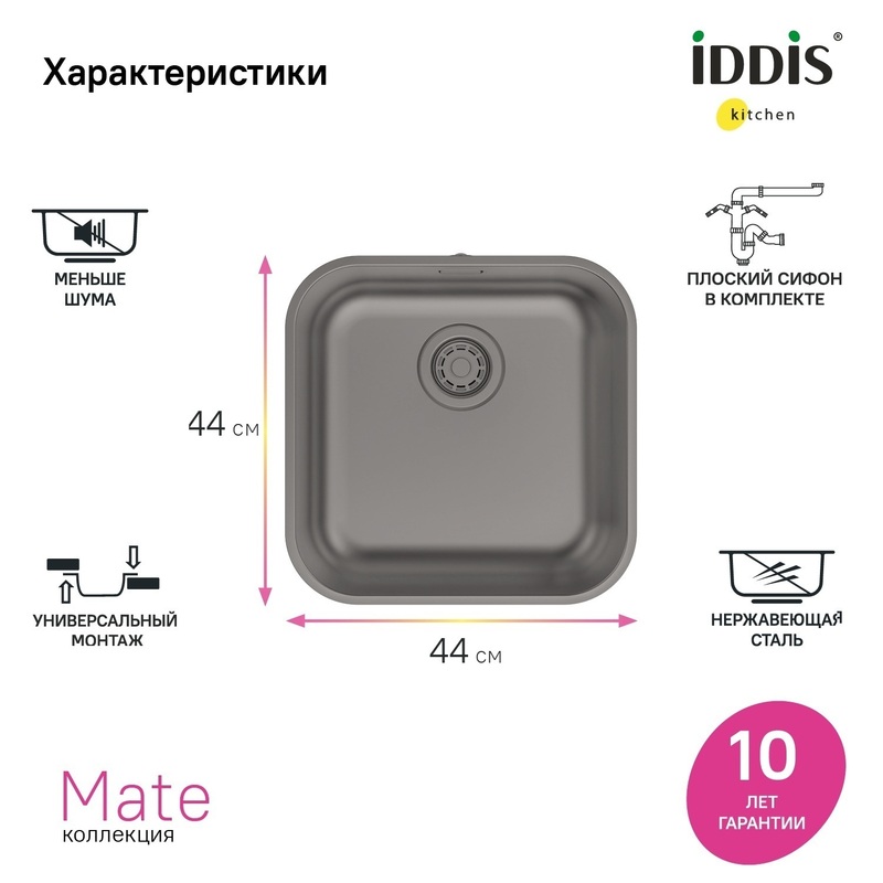 Мойка из коллекции Mate в цвете графит – простое универсальное решение для современной кухни по привлекательной цене. Актуальный лаконичный дизайн без крыла. • Компактный востребованный размер: мойка поместится в любой, даже небольшой кухонный гарнитур (от 50 см). • Изготовлена из прочной качественной нержавеющей стали 304 толщиной 0,8 мм. Стойкая к износу, выдерживает различные t, легко моется, долго служит. При правильном уходе надолго сохранит привлекательный внешний вид. • Красивый и стойкий графитовый цвет достигается путем обработки мойки парообразным металлом: частички краски проникают в структуру стали и образуют микрослой (PVD-покрытие) на поверхности. • Специальное антишумовое покрытие и полимерные накладки на обороте чаши снижают шум при использовании. • Удобный универсальный монтаж на ваш выбор: врезным способом поверх столешницы (вырез под мойку составляет 430х430хR82 мм) или подстольный (вырез под мойку составляет 410х410хR83 мм). • Все необходимое для установки в комплекте: выпуск с переливом, плоский сифон, экономящий полезное пространство под мойкой и два комплекта крепежей (врезной и подстольный). Гарантия на мойку IDDIS® – 10 лет, на выпуск, крепления и сифон – 1 год. (с) Авторский текст, декабрь 2025 г.