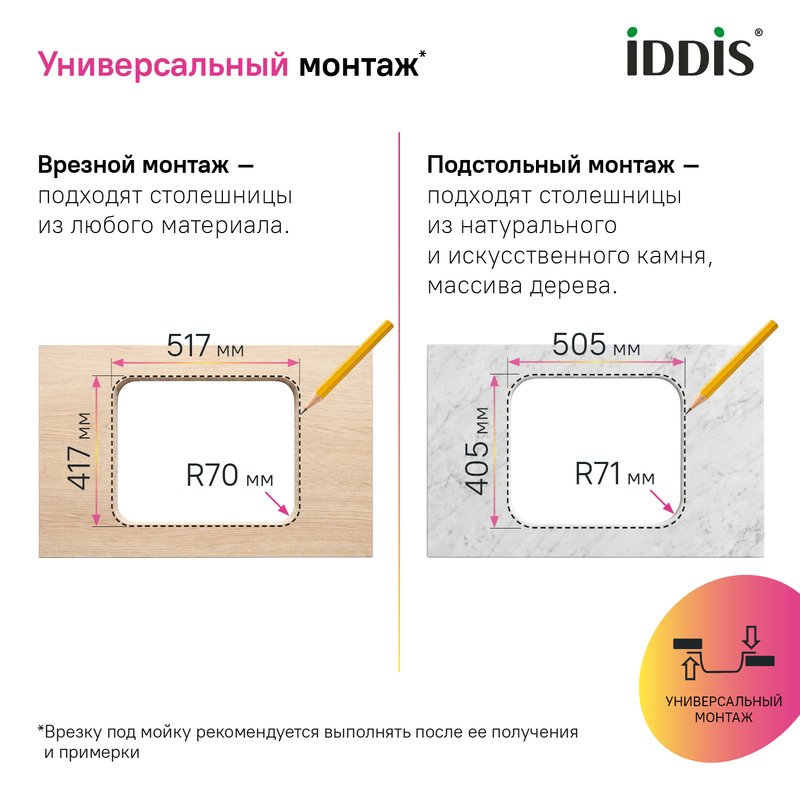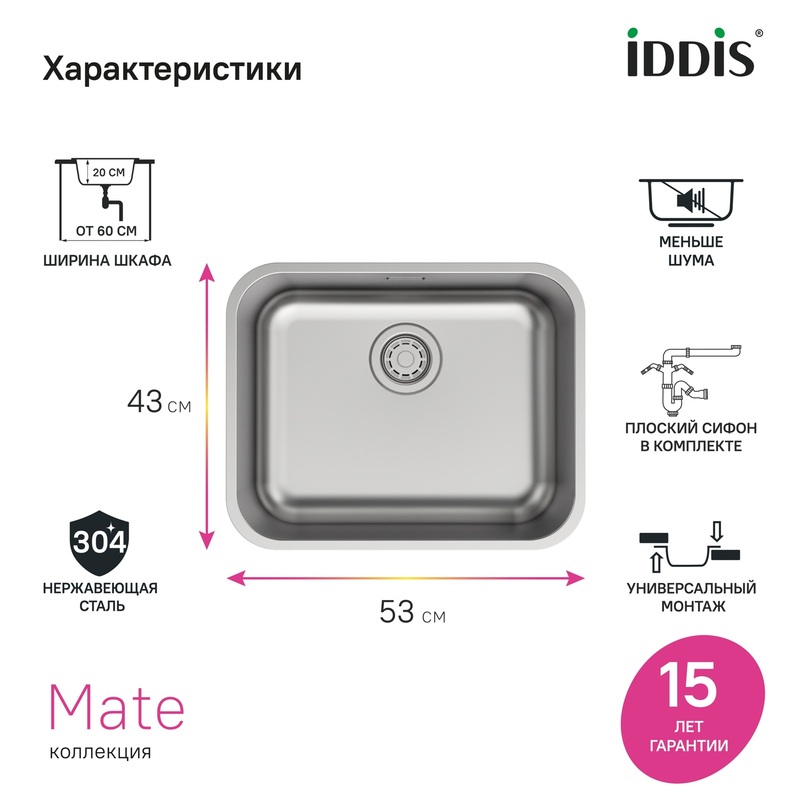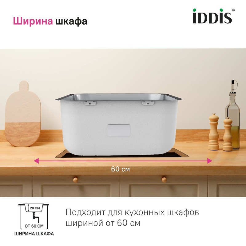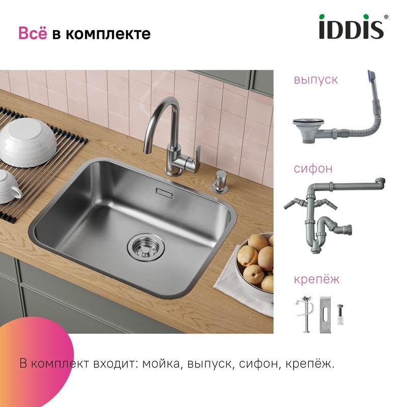 Сатиновая мойка из коллекции Мейт (Mate) – простое универсальное решение для современной кухни по привлекательной цене. Современный лаконичный дизайн без крыла. • Востребованный размер: мойка поместится в любой кухонный гарнитур от 60 см. • Качественная нержавеющая сталь марки AISI 304 толщиной 0,8 мм; сталь содержит 18% хрома и 8% никеля, что надежно защищает ее от коррозии. Стойкая к износу, выдерживает различные температуры, легко моется, долго служит. При правильном уходе надолго сохранит привлекательный внешний вид. • Специальное антишумовое покрытие и полимерные накладки на обороте чаши снижают шум при использовании. • Удобный универсальный монтаж на ваш выбор: врезным способом поверх столешницы (вырез под мойку составляет 517х417хR70 мм) или подстольный (вырез под мойку составляет 505х405хR71 мм). • Все необходимое для установки в комплекте: выпуск с переливом, плоский сифон, экономящий полезное пространство под мойкой и два комплекта крепежей (врезной и подстольный). Гарантия на мойки IDDIS® – 15 лет, на выпуск, крепления и сифон – 1 год. В зависимости от партии внешний вид мойки и ее комплектация могут незначительно отличаться. (с) Авторский текст, декабрь 2025 г.