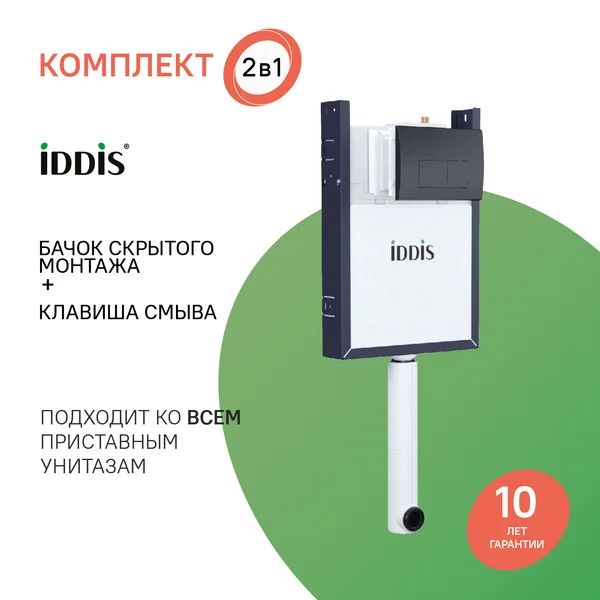Универсальный бачок с верхним подводом воды и фронтальным расположением клавиши смыва для комплектации напольных унитазов. В комплекте черная клавиша с двумя кнопками – для полного и экономичного смыва. • Оснащен всем необходимым для простого и быстрого монтажа, дальнейший сервис и оперативное перекрытие воды возможны без использования инструментов. • Монтируется в готовую стену или зашивается в декоративный короб. Такой скрытый монтаж увеличивает полезную площадь туалета на 10-20 см. • Цельносварная металлическая рама обеспечивает дополнительную надежность. • Теплоизоляция бачка из полипропилена препятствует образованию конденсата, что исключает возникновение сырости. • Возможность использования полного и частичного смыва позволяет существенно сократить расход воды без ущерба комфорту. Расходы на коммунальные платежи снижаются. Гарантия на смывные бачки IDDIS® – 10 лет. (с) Авторский текст, июнь 2023 г.