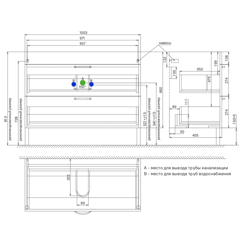 | 1. 959OX10WMB | Фасад ящика (верхний/нижний) тумбы для ванной комнаты, напольная, белая, 100 см, OxfordСКЛ | |