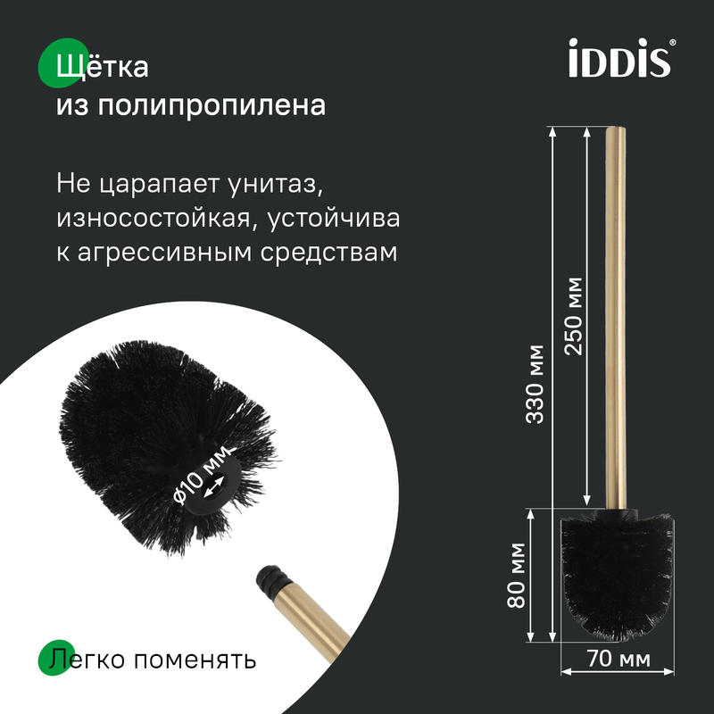 Стильный подвесной ёрш Petite в матовом золотом цвете с колбой из матового белого стекла. Petite – базовая коллекция функциональных аксессуаров для ванной с минималистичным, спокойным дизайном и округлыми формами, что делает её универсальным украшением любого современного санузла. Аксессуары в благородном оттенке матового золота преобразят интерьер, сделают его завершённым и ярким. Идеально дополнят смесители IDDIS® из коллекций Aiger и Duna по цвету и форме. Имеет компактный размер, что экономит пространство и упрощает уборку. Щётка идеального размера для удобной уборки не царапает унитаз. Износостойкая, устойчива к агрессивным средствам. Основной материал – нержавеющая сталь, что позволяет эксплуатировать аксессуары во влажном помещении ванной и даже в жёсткой воде на протяжении длительного времени. Повышенная стойкость к бытовой химии и механическим повреждениям благодаря надёжному PVD-покрытию. Уплотнительная прокладка надёжно фиксирует колбу в держателе и предотвращает её повреждение. Ёрш удобен в установке, монтаж не требует профессиональных навыков. Крепёжные элементы скрыты корпусом, что обеспечивает привлекательный и аккуратный внешний вид. Гарантия на аксессуары для ванной IDDIS® – 5 лет. (с) Авторский текст, август 2025 г.