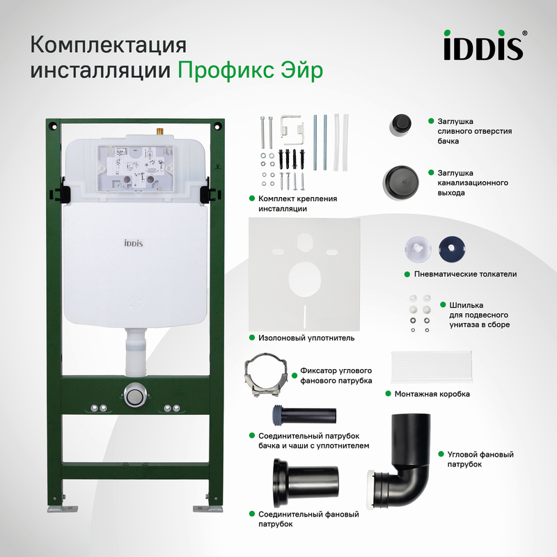 Рамная инсталляция для подвесного унитаза Profix Air с пневматическим управлением, что обеспечивает бесшумный и более упругий, плавный ход клавиши смыва. Совместима с любыми унитазами. В комплекте все необходимое для самостоятельной установки и подсоединения подвесного унитаза. К инсталляции Profix Air подходят только клавиши IDDIS® Profix Air. Механизм работает за счет подачи сжатого воздуха: при нажатии на клавишу помпа распределяет сжатый воздух по системе трубок, запуская сливной механизм. Более гибкая настройка смыва за счет пневматического управления – 6 регулировок частичного и 12 регулировок полного смыва. Удобное обслуживание через монтажное окошко – кнопка легко отщелкивается, открывая доступ к арматуре бачка. Регулируется по высоте (0-200 мм) и глубине (до 70 мм), что позволяет удобно подстроить под условия конкретного санузла. Рама из прочной стали толщиной 2,3 мм. Высококачественное порошковое покрытие препятствует коррозии металла в течении длительного срока эксплуатации, поэтому инсталляция прослужит дольше даже в помещении с повышенной влажностью. Клепаные крепежные гайки для крепления унитаза надежно фиксируют его и обеспечивают дополнительную защиту рамы от механического воздействия. Фиксаторы и пружины пневматических трубок служат для их надежной фиксации внутри бачка, препятствуя преждевременному износу и перегибу. Гарантия на инсталляции IDDIS® – 10 лет. (с) Авторский текст, ноябрь 2024 г.