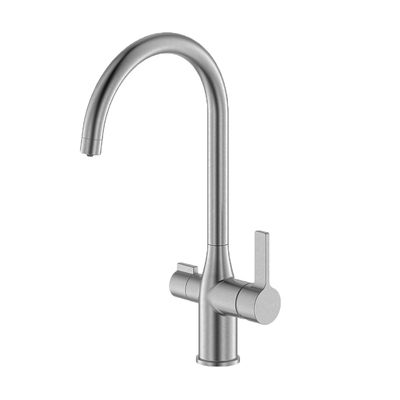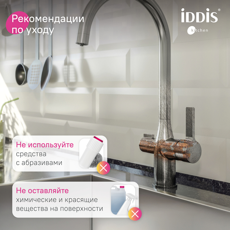 Cатиновый смеситель для кухни Pure с отдельным каналом для подачи фильтрованной воды будет незаменим на современной кухне. • Не требует дополнительного отверстия в мойке под фильтр. К смесителю можно подключить фильтр любого производителя и наслаждаться чистой водой прямо из смесителя – она удобно включается отдельной ручкой на корпусе. • Угол открывания ручки – 110 градусов (30 градусов от себя – холодная вода, 80 на себя – горячая). Угол может отличаться в зависимости от партии. • Надежный корпус из прочной латуни — стойкий к коррозии, резким изменениям давления и перепадам температуры воды. • Поверхность устойчива к появлению царапин и потускнению (при должном уходе). На протяжении многих лет она будет выглядеть как новая. • Керамический картридж обеспечивает точную регулировку температуры и напора воды за счет особенно плавного хода ручки смесителя. • Цвет смесителя отличается от оттенка стальной сатиновой мойки. • Гарантия на смеситель IDDIS® — 10 лет. (с) Авторский текст, март 2023 г.